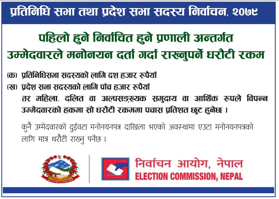 आयोगका अनुसार प्रतिनिधि सभा सदस्य निर्वाचनमा उम्मेदवार बन्न चाहनेले दश हजार रूपैयाँ धराैटी जम्मा गर्नुपर्नेछ । त्यस्तै प्रदेश सभा सदस्यको उम्मेदवारले पाँच हजार रूपैयाँ धराैटी जम्मा गर्नुपर्नेछ ।