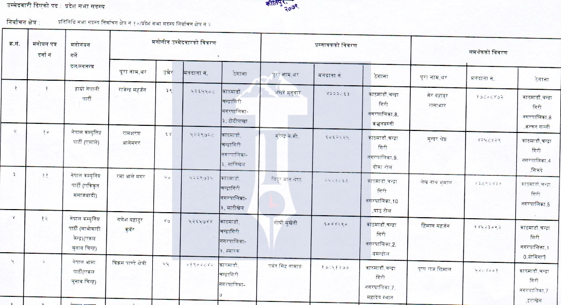 काठमाण्डाै १०, प्रदेश ख मा सांसद् बन्न २ स्वतन्त्र सहित १२ जनाको उम्मेदवारी (सूचीसहित)