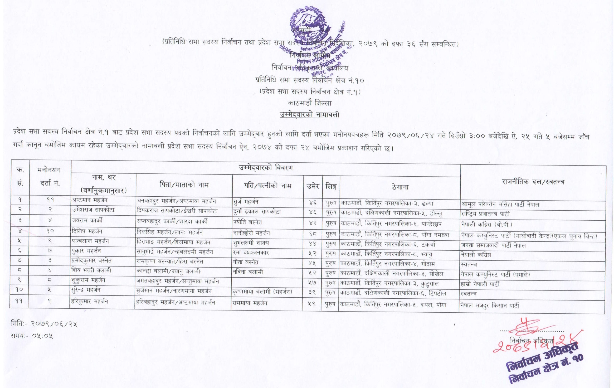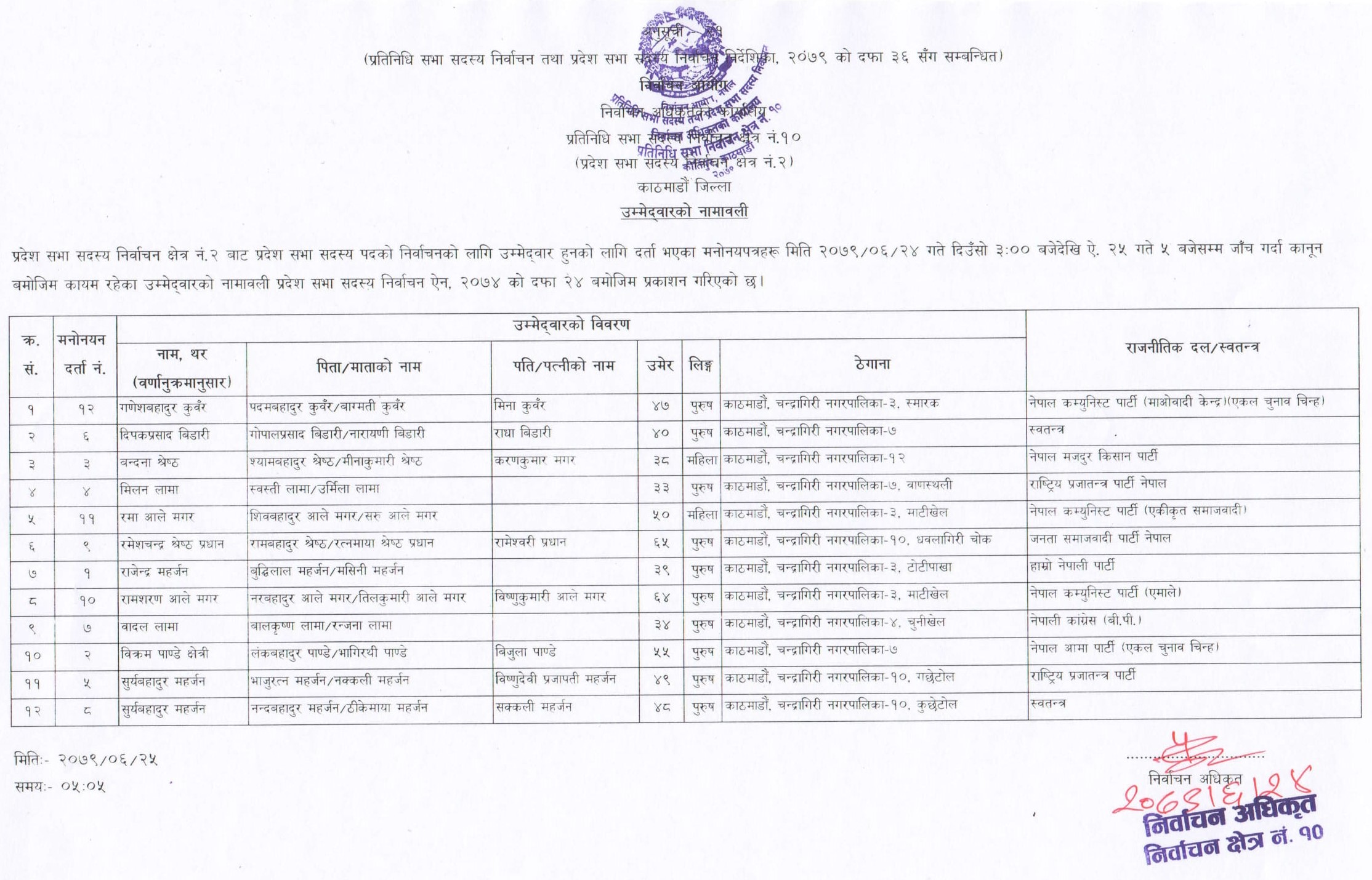 प्रदेश तर्फ काठमाण्डाै क्षेत्र नं. १० ख मा प्रदेश सभा सदस्य निर्वाचनका लागि उम्मेदवारी दर्ता गराउने उम्मेदवारको सूची हेर्नुहोस्ः