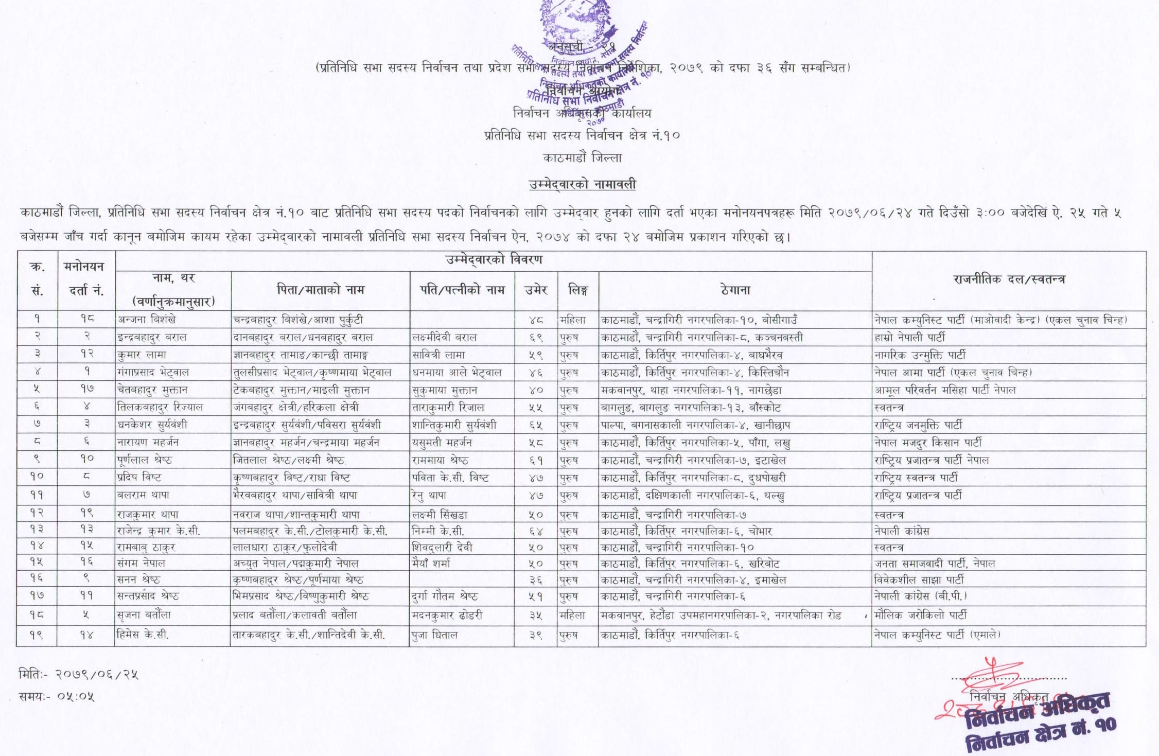 प्रदेशतर्फ काठमाण्डाै क्षेत्र नं. १० क मा प्रदेश सभा सदस्य निर्वाचनका लागि उम्मेदवारी दर्ता गराउने उम्मेदवारको सूची हेर्नुहोस्ः