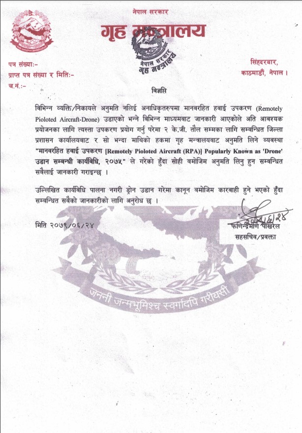 दुई केजी तौलभन्दा बढीको ड्रोन उडाउन परेमा गृह मन्त्रालयबाट अनुमति लिनुपर्ने विज्ञप्तिमा उल्लेख छ ।