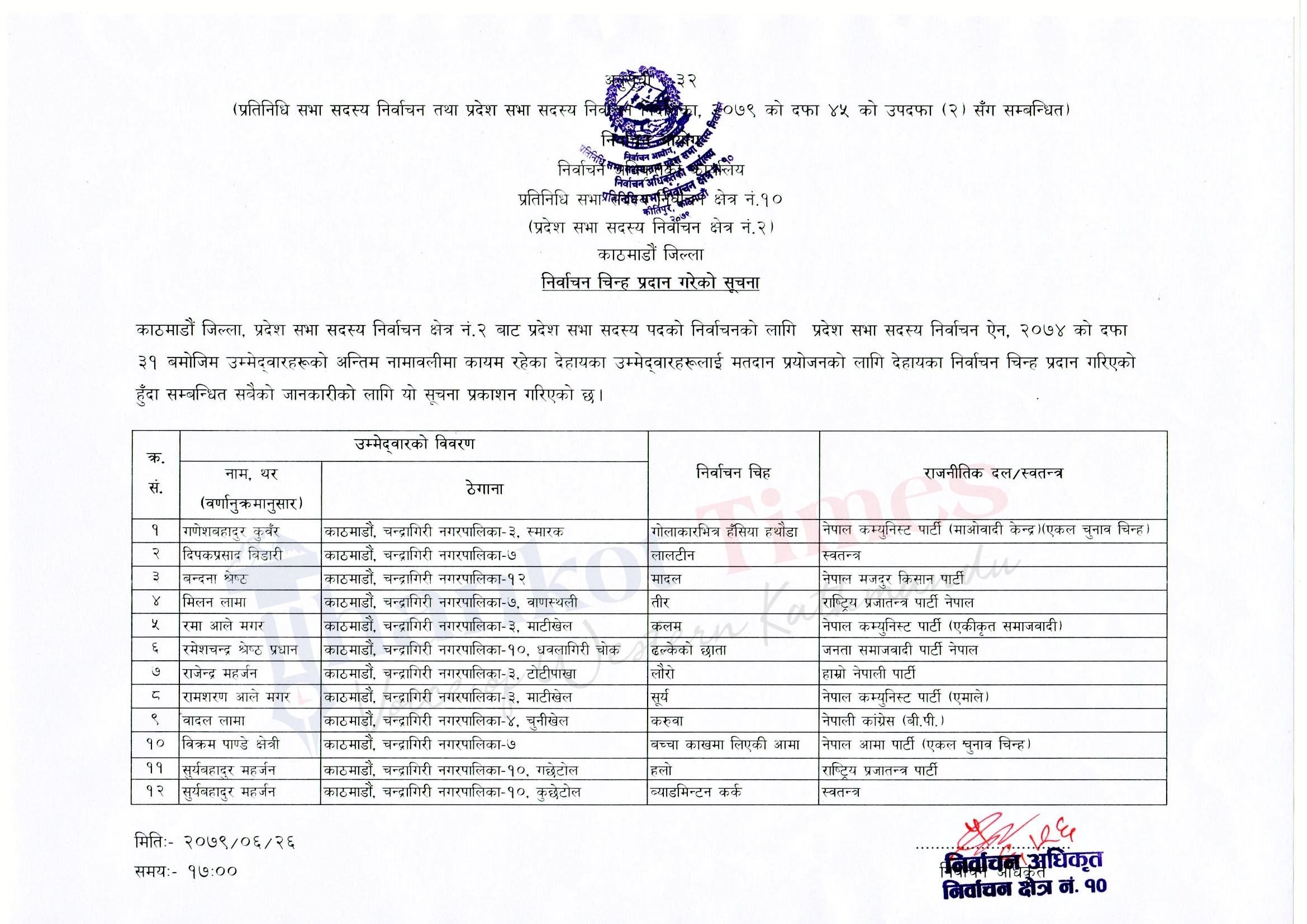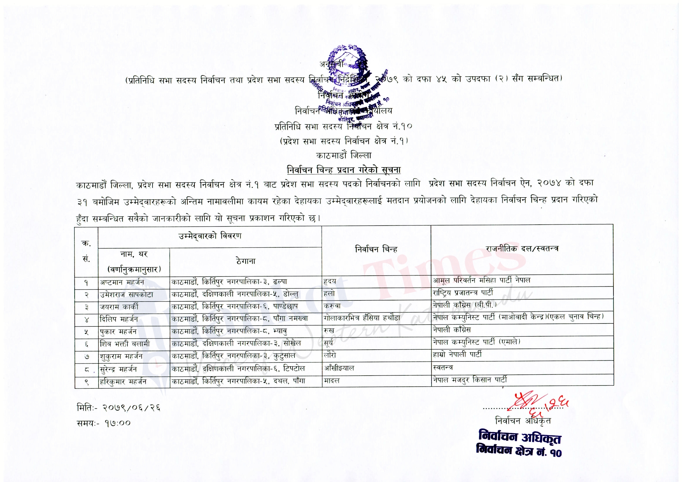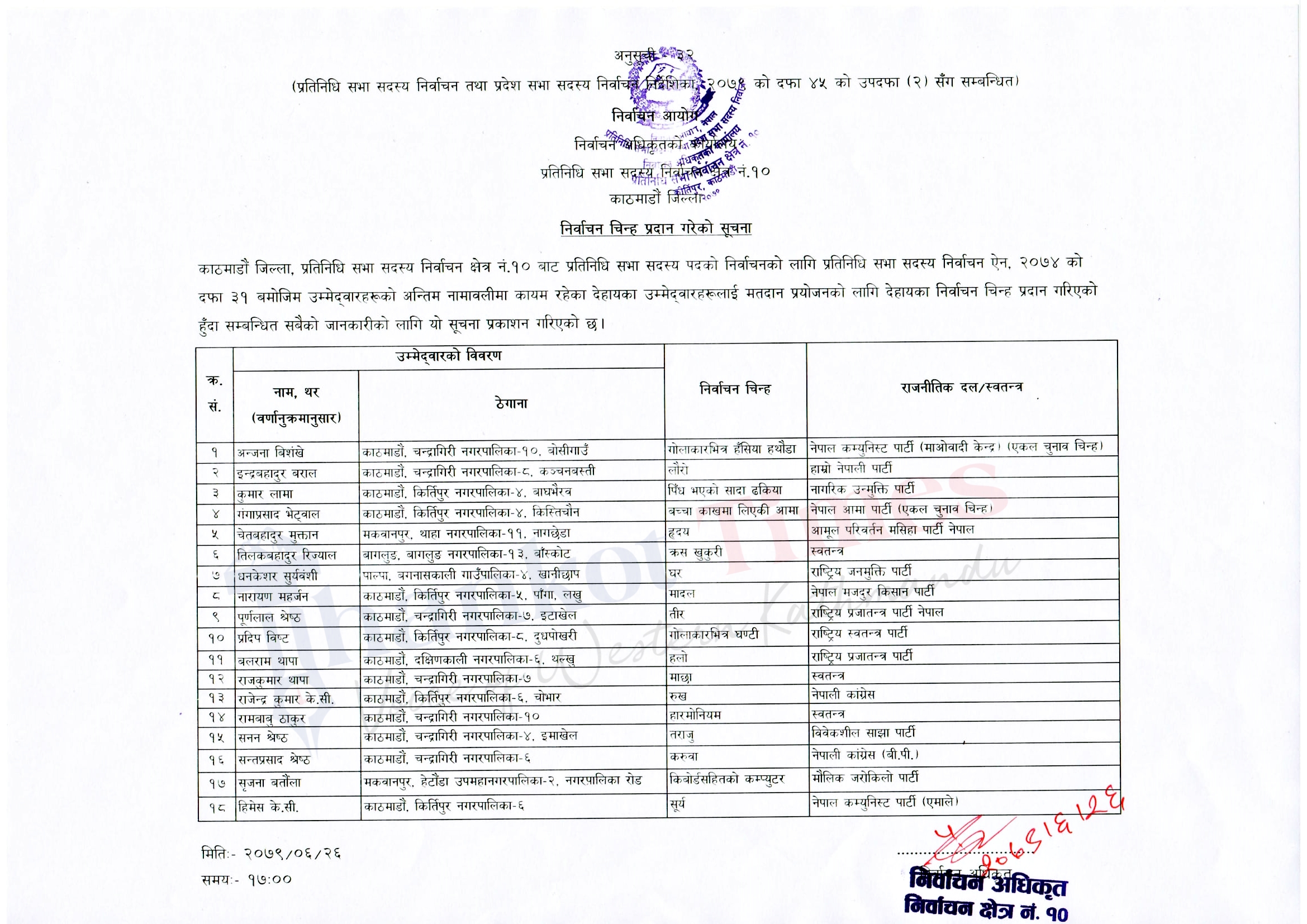 काठमाण्डाैका क्षेत्र नं. १० का उम्मेदवारलाई माछादेखी हारमोनियमसम्मका चुनाव चिन्ह
