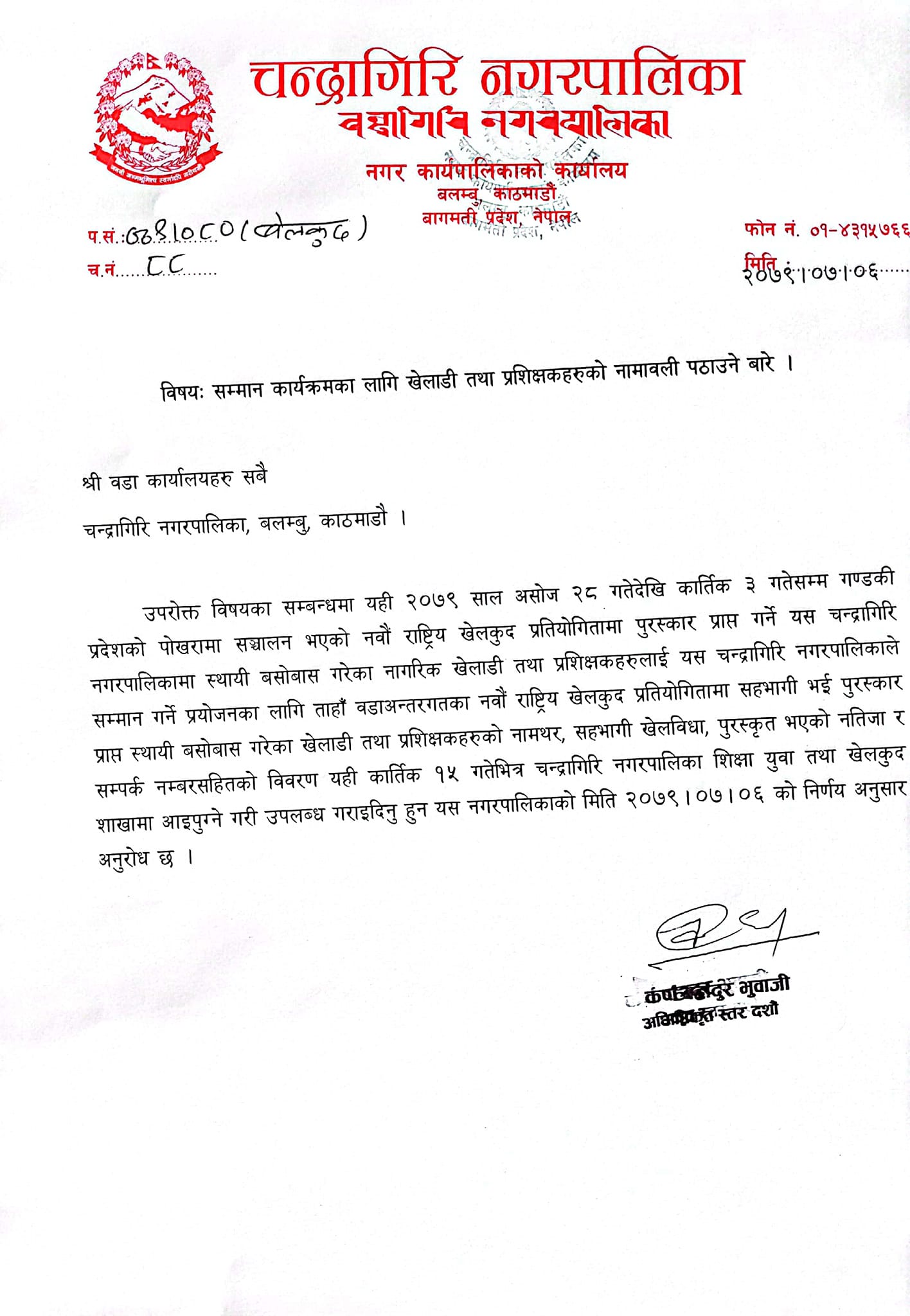 आइतबार एक सूचना जारी गर्दै नगरले असोज २८ देखी कार्तिक ३ गतेसम्म गण्डकी प्रदेशमा सम्पन्न नवाैं राष्ट्रिय खेलकुदमा पदक प्राप्त चन्द्रागिरि नगरमा स्थायी रूपमा बसोबास गर्ने खेलाडी तथा प्रशिक्षकहरूको विवरण कार्तिक १५ गतेभित्र नगरपालिकाको कार्यालयमा पेश गर्न सबै वडाहरूमा अनुरोध गरेको छ ।