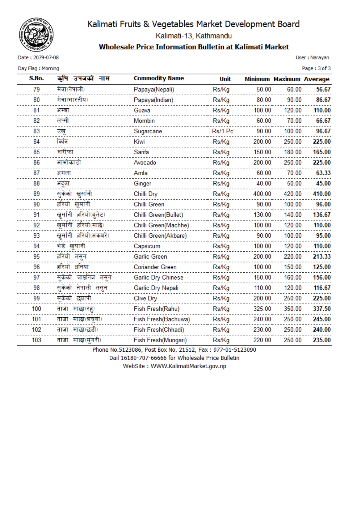 बोर्डका अनुसार कालिमाटी फलफूल तथा तरकारी बजारमा आज ठूलो गोलभेँडा (भारतीय) ८० देखि ९० रूपैयाँसम्ममा कारोबार भइरहेको छ । रातो आलुको मूल्य प्रतिकिलो ९० रुपैयाँदेखि ९५ रुपैयाँसम्म छ ।