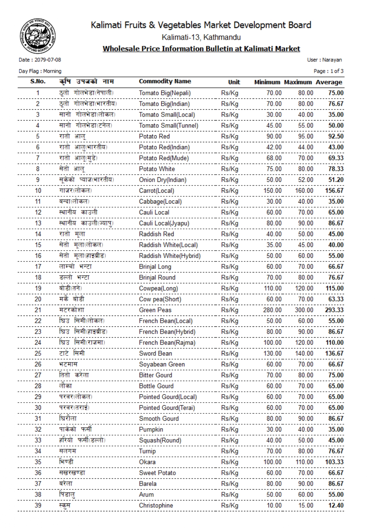 बोर्डका अनुसार कालिमाटी फलफूल तथा तरकारी बजारमा आज ठूलो गोलभेँडा (भारतीय) ८० देखि ९० रूपैयाँसम्ममा कारोबार भइरहेको छ । रातो आलुको मूल्य प्रतिकिलो ९० रुपैयाँदेखि ९५ रुपैयाँसम्म छ ।