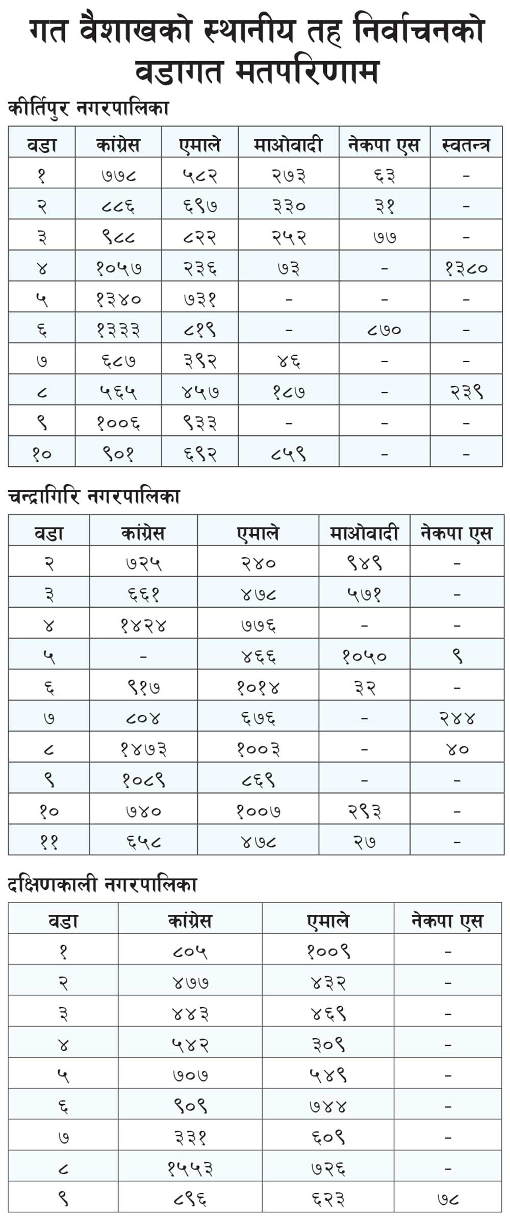 यसैगरी, दक्षिणकाली नगरपालिकामा एमालेका श्रीराम आचार्यलाई हराएर कांग्रेसका मोहन बस्नेत निर्वाचित भएका थिए । बस्नेतले सात हजार दुई सय एक मत ल्याउँदा आचार्यले पाँच हजार एक सय ९२ मत ल्याएका थिए । नौ वडामध्ये तीन वडामा एमालेले जित्दा ६ वडामा कांग्रेसले जित निकालेको थियो ।