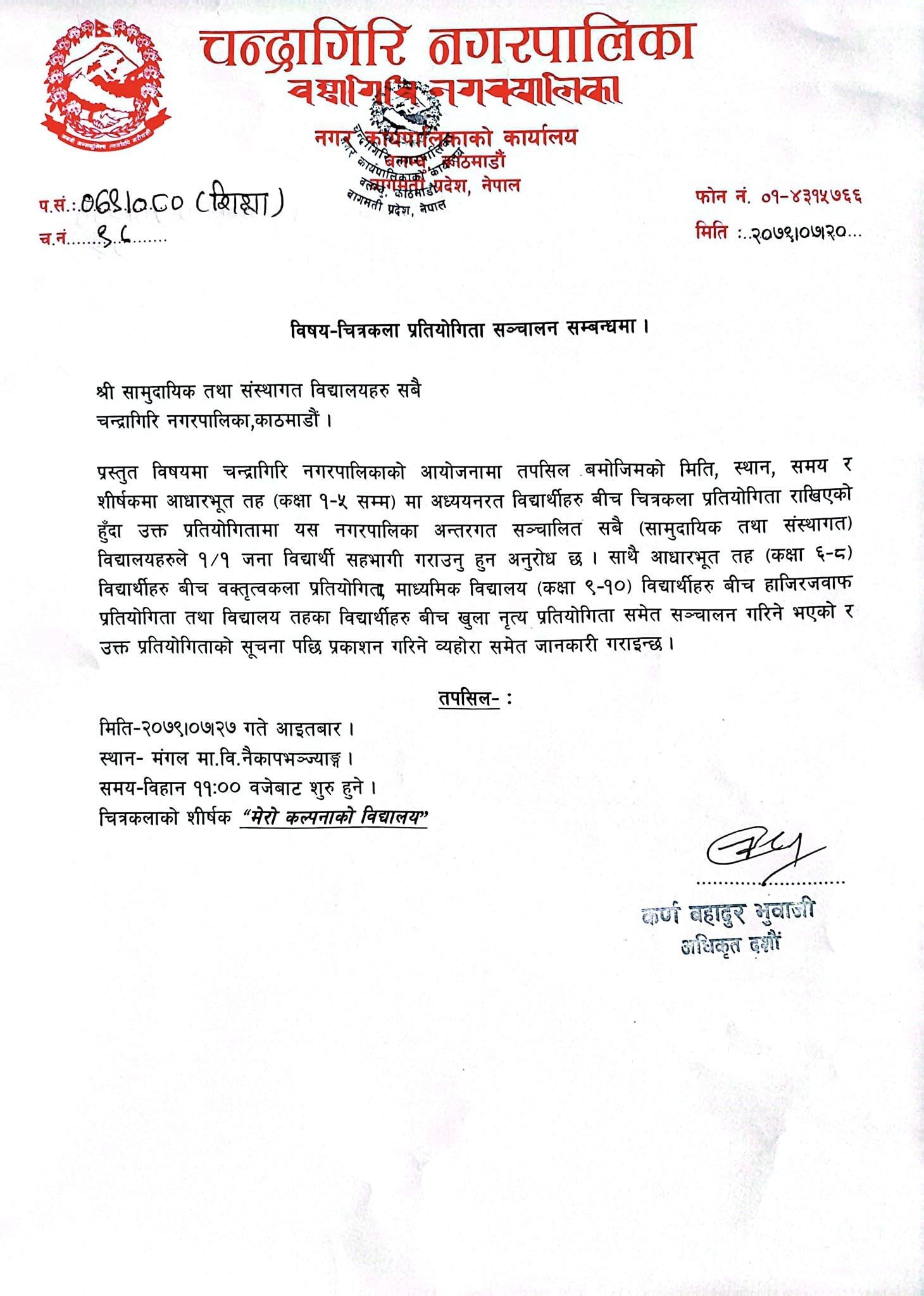 विद्यालय तहमा अध्ययनरत विद्यार्थीहरूको प्रतिभा पहिचानका लागि चन्द्रागिरि नगरपालिकाले विविध प्रतियोगितात्मक कार्यक्रमहरू संचालन गर्ने भएको छ । सो कार्यक्रम अन्तर्गत नगरपालिकाले कार्तिक २७ गते आइतबार आधारभूत तहका विद्यार्थीहरूबीच खुल्ला चित्रकला प्रतियोगिता आयोजना हुने तालिका सार्वजनिक गरेको छ ।