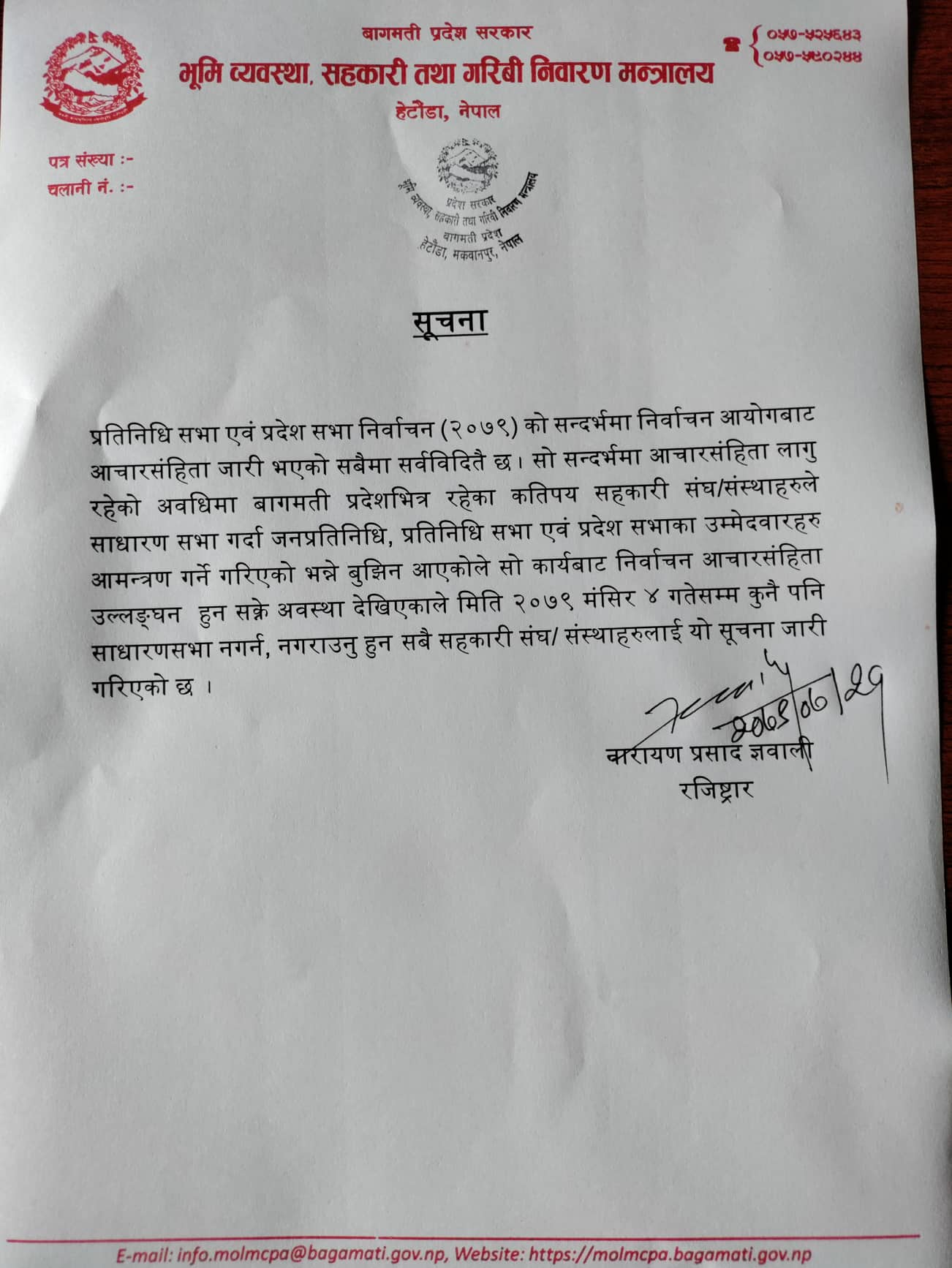 ‘प्रतिनिधि सभा एवं प्रदेश सभा निर्वाचन (२०७९) को सन्दर्भमा निर्वाचन आयोगबाट आचारसंहिता जारी भएको सबैमा सर्वविदितै छ। सो सन्दर्भमा आचारसंहिता लागु रहेको अवधिमा बागमती प्रदेशभित्र रहेका कतिपय सहकारी संघ/संस्थाहरुले साधारण सभा गर्दा जनप्रतिनिधि, प्रतिनिधि सभा एवं प्रदेश सभाका उम्मेदवारहरु आमन्त्रण गर्ने गरिएको भन्ने बुझिन छ ।