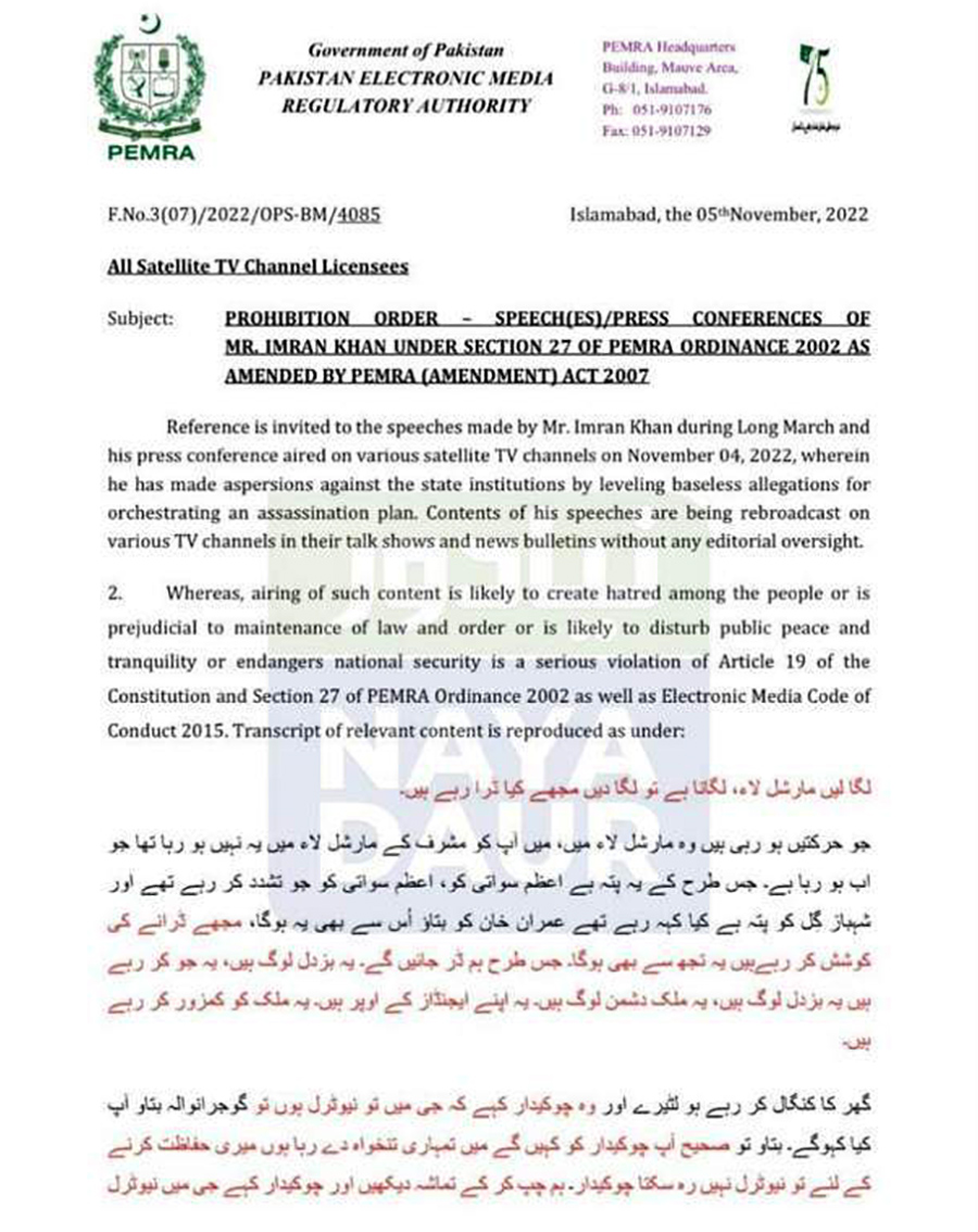 इमरान खानले आपत्तीजनक र कानुन विपरीतका अभिव्यक्ति दिएको भन्दै पाकिस्तान इलेक्ट्रोनिक मिडिया रेगुलेटरी अथोरिटी (पेमरा)ले भनेको छ, ‘टेलिभिजन च्यानलहरुले पूर्वप्रधानमन्त्री इमरान खानको कुनै पनि भाषण र पत्रकार सम्मेलन प्रसारण गर्ने छैनन् ।’ यो निर्देशन उल्लंघन गर्ने च्यानलहरुको लाइसेन्स रद्द गरिदिने चेतावनीसमेत उसले दिएको छ ।