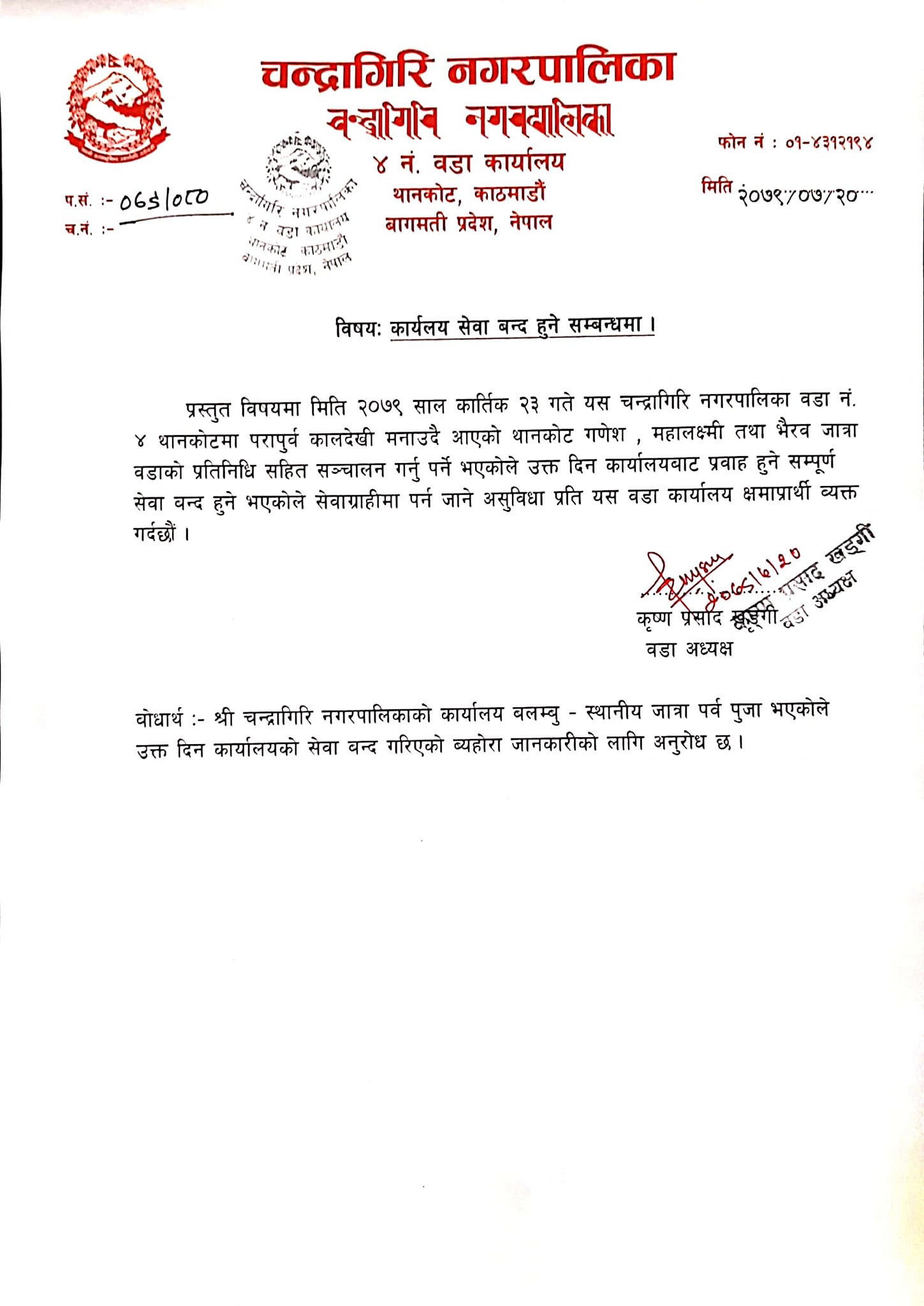 सोमबार एक सूचना जारी गर्दै वडा कार्यालयले परापूर्व कालदेखी वार्षिक रूपमा मनाइँदै आइएको गणेश, नारायण, महालक्ष्मी, भैरव जात्रा सञ्चालनका लागि वडाका प्रतिनिधिसहित सञ्चालन गर्नुपर्ने भएकोले सो दिन कार्यालयबाट प्रवाह हुने सम्पूर्ण सेवा बन्द हुने जनाइएको छ ।