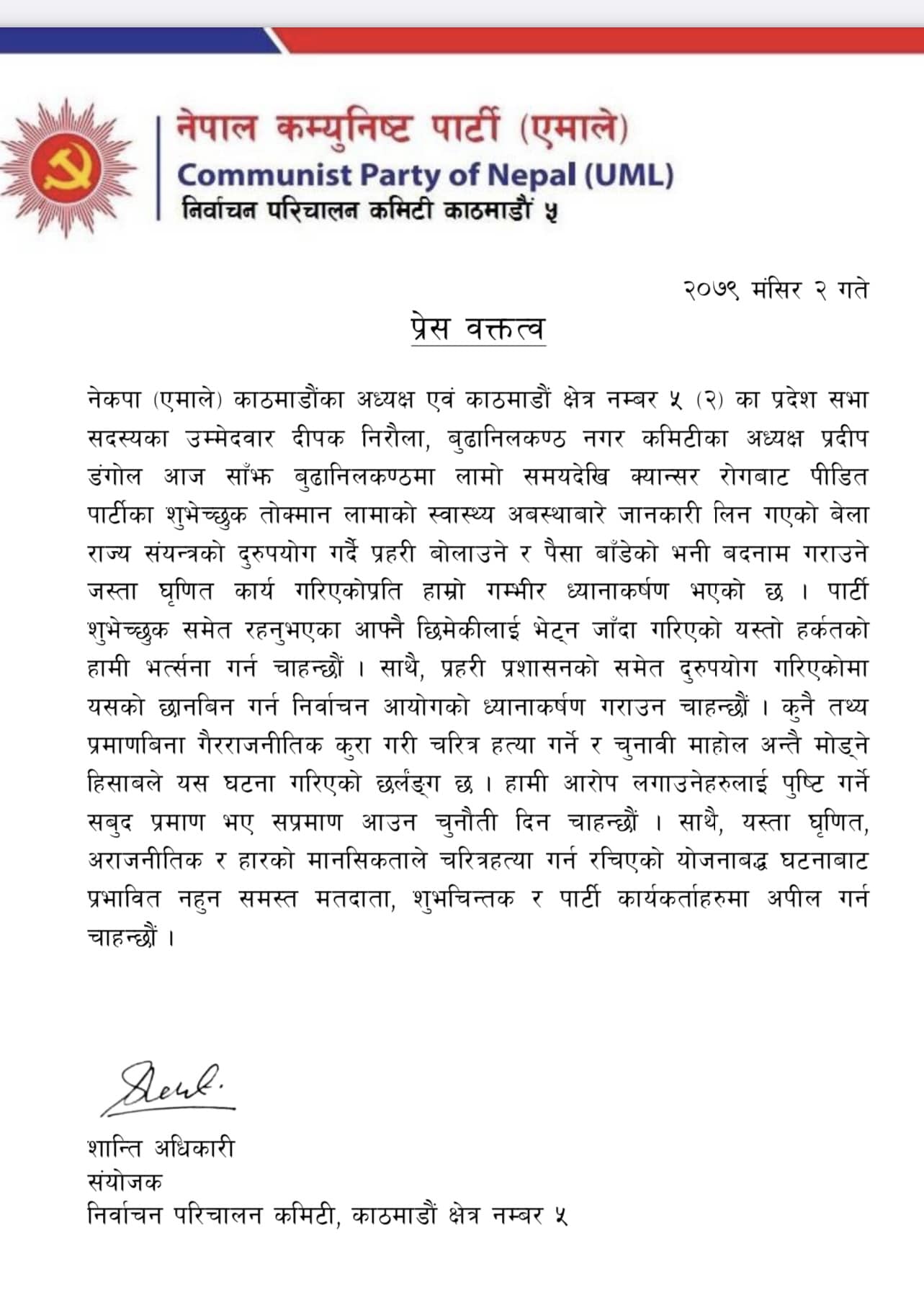 काठमाडौँ क्षेत्र नम्बर ५ निर्वाचन परिचालन कमिटीकी संयोजक शान्ति अधिकारीले  एक विज्ञप्ति जारी गर्दै निरौला र डंगोल बुढानीलकण्ठमा लामो समयदेखि क्यान्सर रोगबाट पीडित पार्टीका शुभेच्छुक तोक्तान लामाको स्वास्थ्य अवस्थाबारे जानकारी लिन गएको दाबी गरेकी छिन् । विज्ञप्तिमा भनिएको छ, ‘राज्य संयन्त्रको दुरुपयोग गर्दै प्रहरी बोलाउने र पैसा बाँडेको भनी बदनाम गराउने जस्ता घृणित कार्य गरिएकोप्रति हाम्रो गम्भीर ध्यानाकर्षण भएको छ । पार्टी शुभेच्छुक समेत रहनुभएका आफ्नै छिमेकीलाई भेट्न जाँदा गरिएको यस्तो हर्कतको हामी भर्त्सना गर्न चाहन्छौँ ।‘