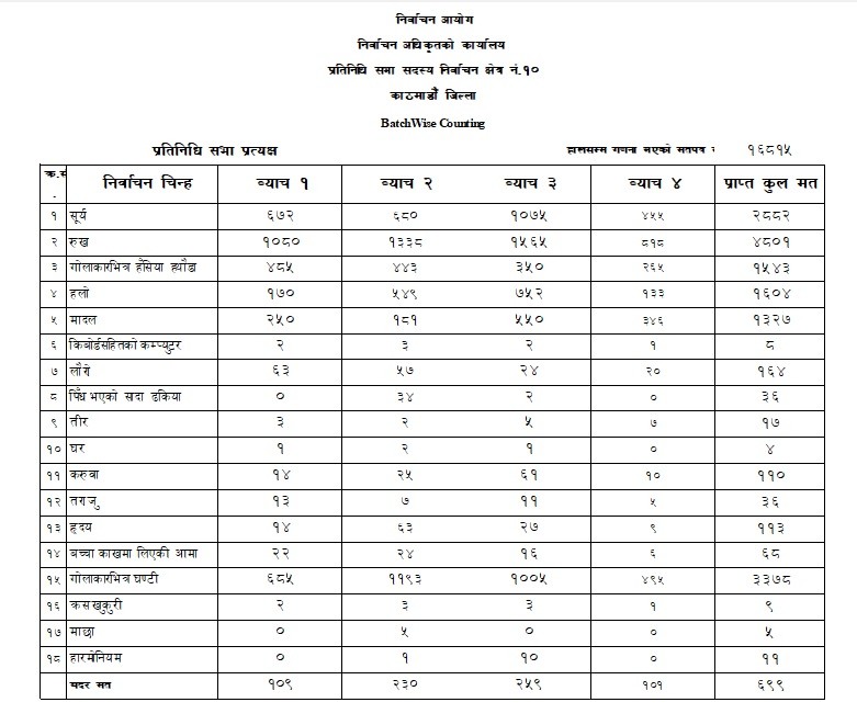 कुल १६८१५ मत गणना भइसक्दा रूखमा चिन्हमा ४८०१ मत परेको छ । सूर्य चिन्हमा २८८२, घण्टी चिन्हमा ३३७८, हँसिया हताैडा चिन्हमा १५४३ मत परेको छ ।