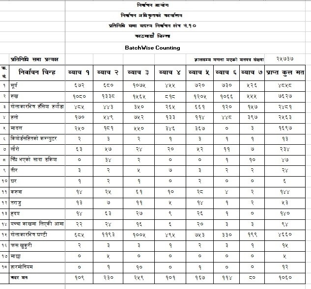 प्रतिनिधि सभा सदस्य निर्वाचन अन्तर्गत काठमाण्डाै क्षेत्र नं. १० को मतगणना जारी छ । हालसम्म यस क्षेत्रको २५ हजार ७३७ मत गणना सकिँदा नेकपा एमाले दोश्रो स्थानमा उक्लिएको छ ।