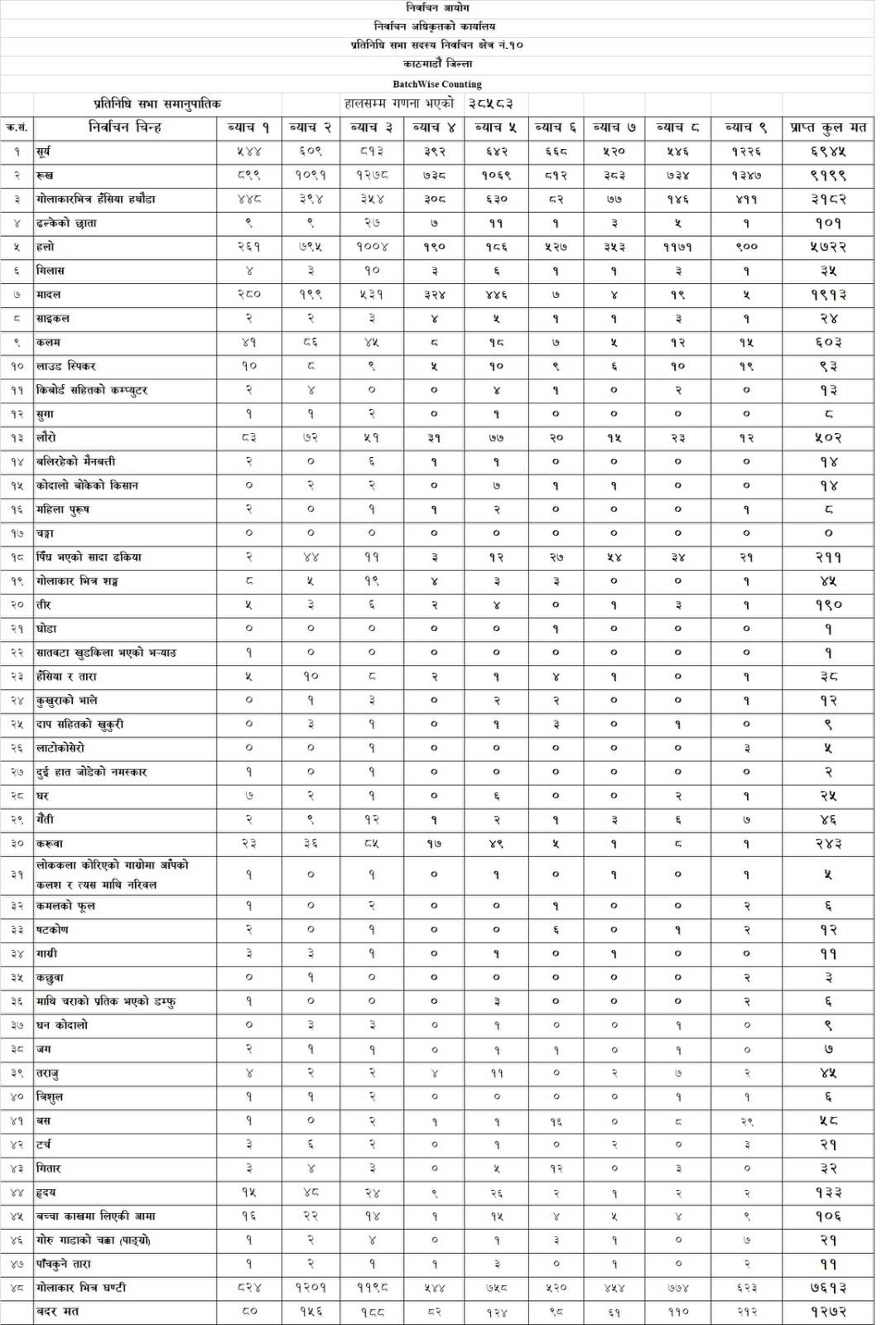 प्रत्यक्षतर्फको मतगणना सम्पन्न भएसँगै काठमाण्डाै क्षेत्र नं. १० तथा प्रदेश तर्फको समानुपातिक मतगणना जारी छ ।