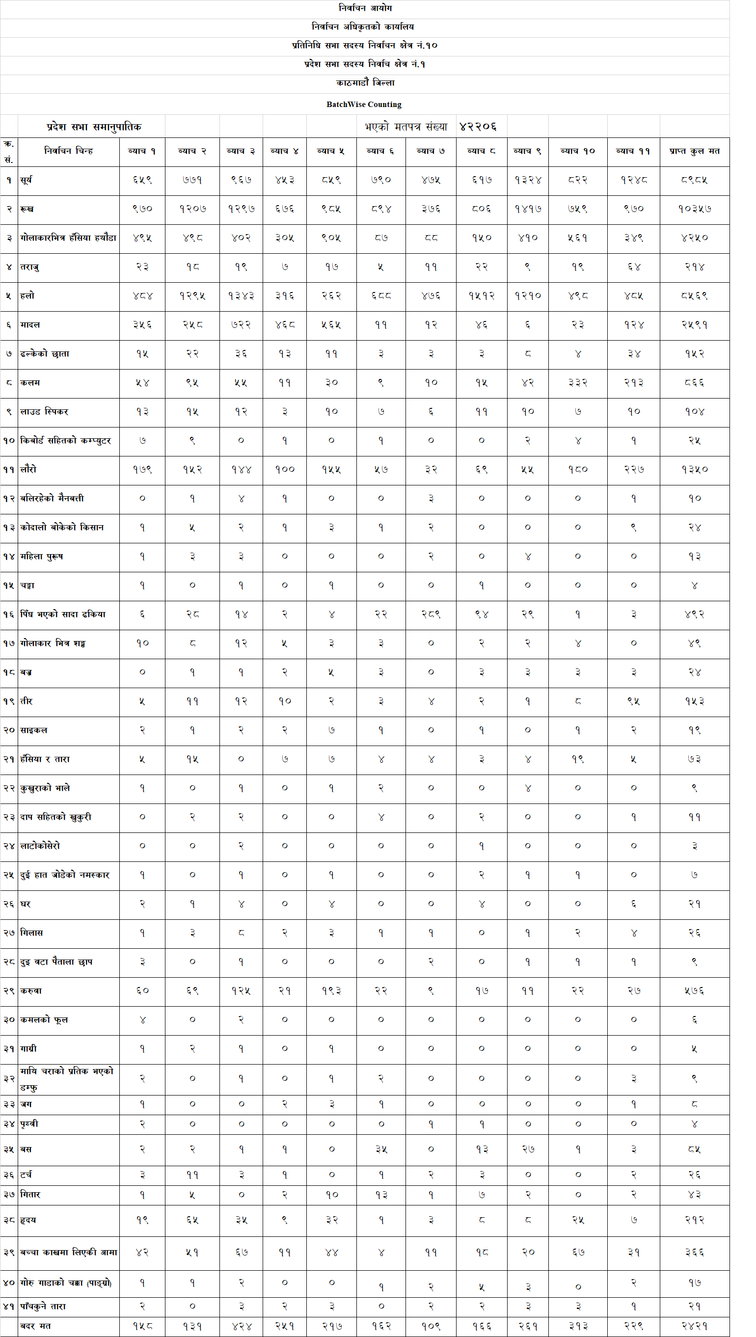 प्रत्यक्षतर्फको मतगणना सम्पन्न भएसँगै काठमाण्डाै क्षेत्र नं. १० तथा प्रदेश तर्फको समानुपातिक मतगणना जारी छ ।