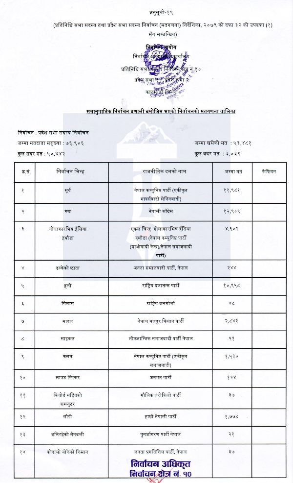 काठमाण्डाै क्षेत्र नं. १० को प्रदेश सभा सदस्यको समानुपातिक पनि रूख पहिलो