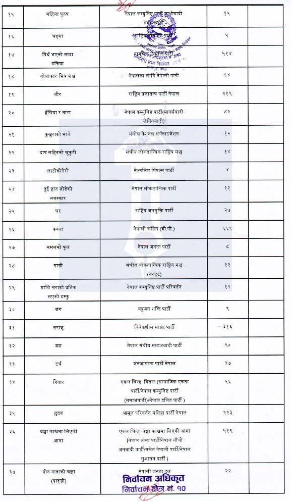 जहाँ रूख चिन्हमा १२९०९, सूर्यमा ११९८१, हलोमा १०९५८, हँसिया हथाैडामा ४९०२, मादलमा २८४१ मत परेको छ ।