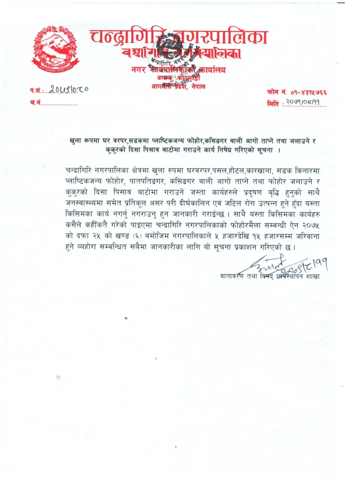 सोमबार सार्वजनिक सूचना प्रकाशन गर्दै नगरले खुल्ला रूपमा घर वरपर तथा सडकमा प्लाष्टिकजन्य फोहोर जलाउन समेत निषेध गरिएको जनाएको छ ।