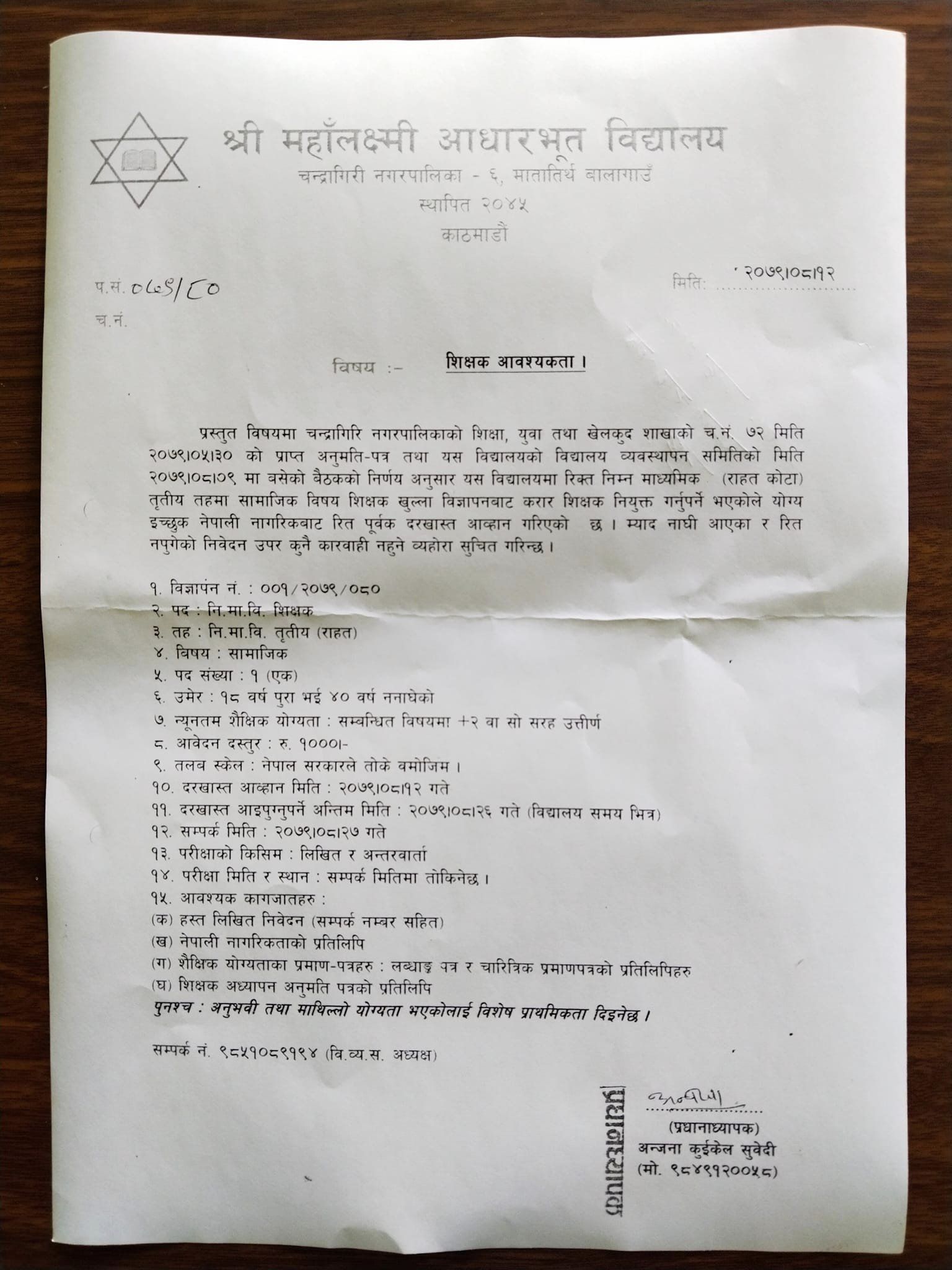 चन्द्रागिरि नगरपालिका-६ मातातीर्थ, बालागाउँस्थित महालक्ष्मी आधारभूत विद्यालयले शिक्षक माग गर्दै सूचना प्रकाशित गरेको छ ।