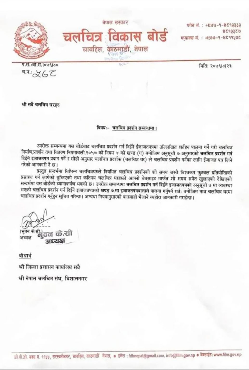 बोर्डले शुक्रबार ७७ रै जिल्ला प्रशासन कार्यालयहरू र चलचित्र संघलाई बोधार्थसहित पत्राचार गरेको छ।
