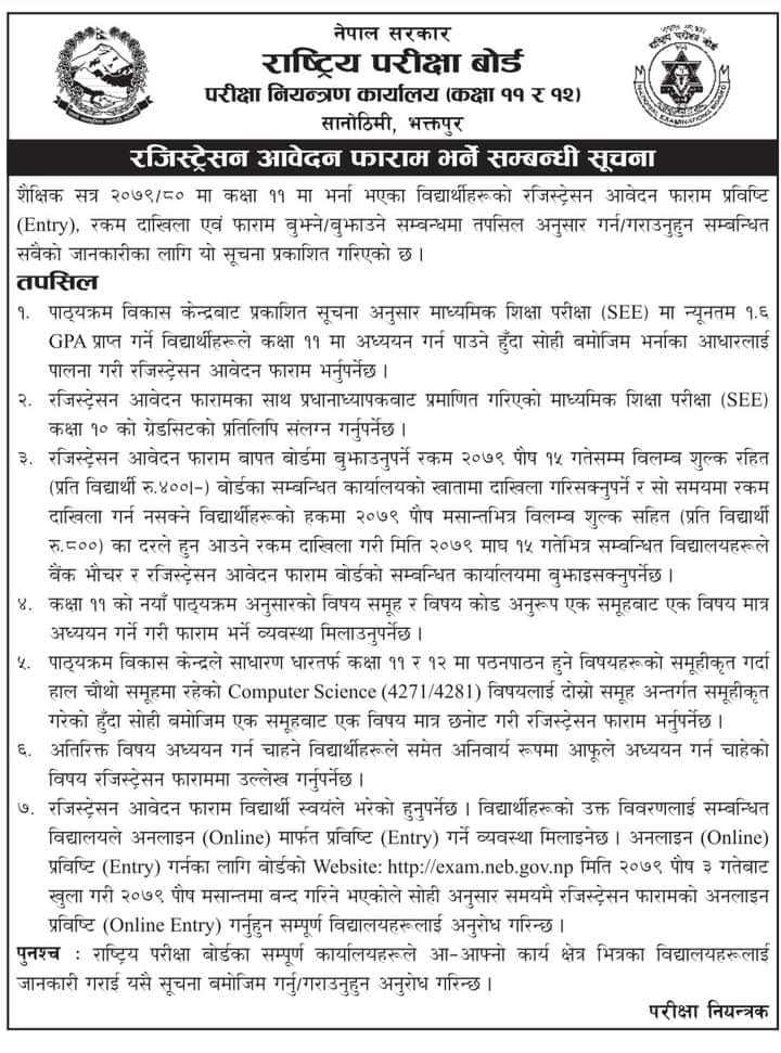 राष्ट्रिय परीक्षा बोर्ड परीक्षा नियन्त्रण कार्यालयले कक्षा ११ को रजिस्ट्रेसन आवेदन फाराम खुला गरेको छ ।