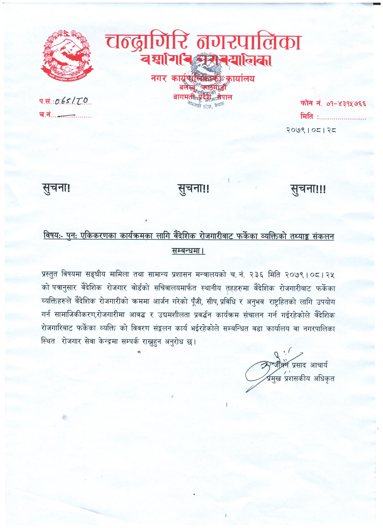 प्रमुख प्रशासकीय अधिकृत जीवनप्रसाद आचार्यका अनुसार वैदेशिक रोजगारीबाट फर्किएका नगरबासीहरूले सम्बन्धित वडा कार्यालय वा नगरपालिकाको कार्यालयस्थित रोजगार सेवा केन्द्रमा सम्पर्क राखी आफ्नो विवरण टिपाउन सक्नेछन् ।
