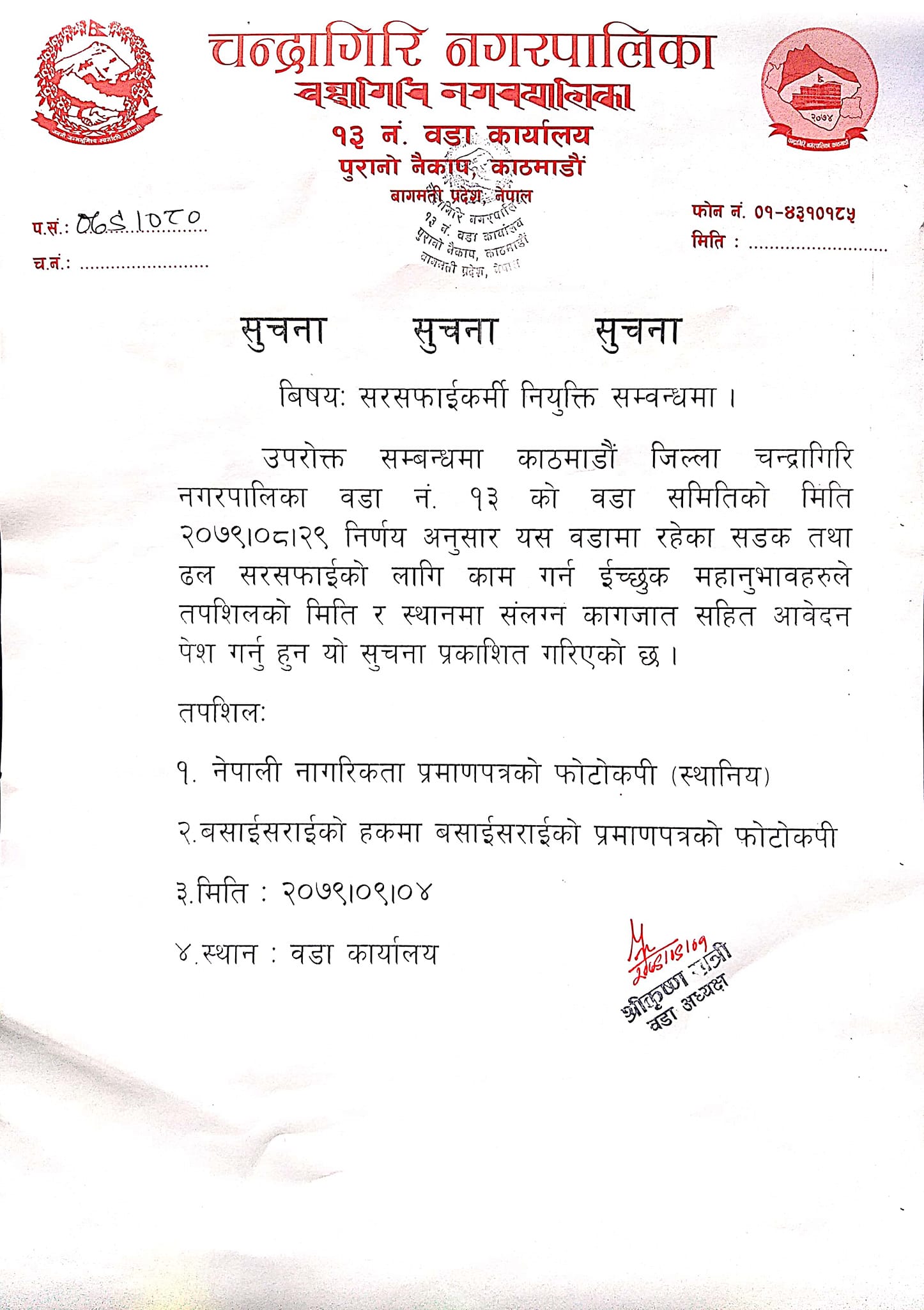 वडामा रहेका सडक तथा नाली सरसफाई गर्ने प्रयोजनका लागि चन्द्रागिरि नगरपालिका वडा नं. १३ को कार्यालयले सरसफाईकर्मी नियुक्त गर्ने भएको छ ।
