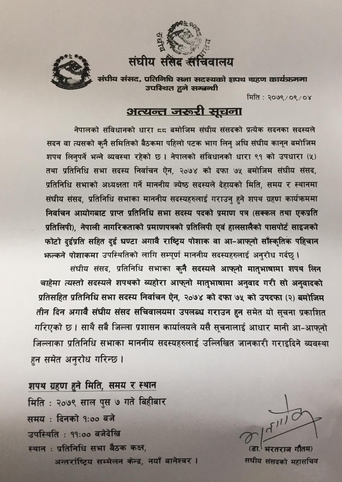 संघीय संसद सचिवालयले पहिलो बैठकमा भाग लिनु अघि नै सांसदहरूलाई शपथ ग्रहणका लागि सूचना प्रकाशित गर्दै निम्तो दिएको हो।