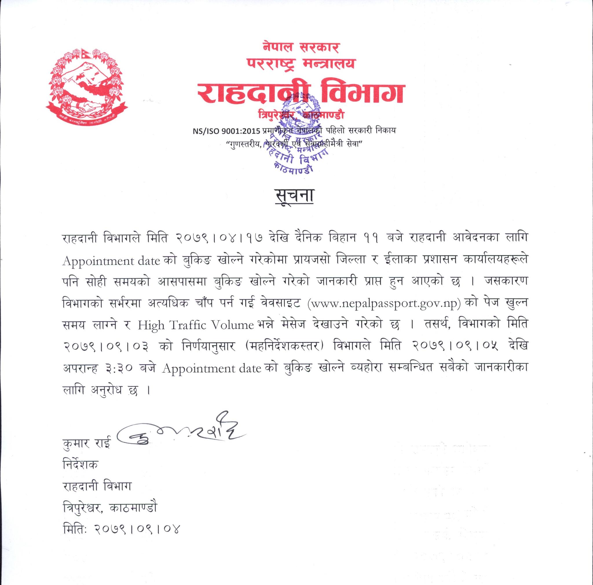 विभागले गत साउन १७ गतेदेखि दैनिक बिहान ११ बजे राहदानी आवेदनका लागि अपोइन्टमेन्ट डेटको बुकिङ खोल्ने व्यवस्था कार्यान्वयनमा ल्याएको थियो । तर अब आज (पुस ५ गतेदेखि) बाट लागू हुनेगरी अपराह्न साढे ३ बजेदेखि मात्र अपोइन्टमेन्ट डेट खोल्ने विभागले जनाएको छ ।