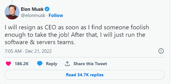 व्यवसायी एलन मस्कले ट्वीटरको प्रमुख कार्यकारी अधिकृत (सीईओ) पदबाट राजीनामा दिने घोषणा गरेका छन् । उनले ट्वीट गरेर सकेसम्म छिटो पद छाड्ने बताएका हुन् ।