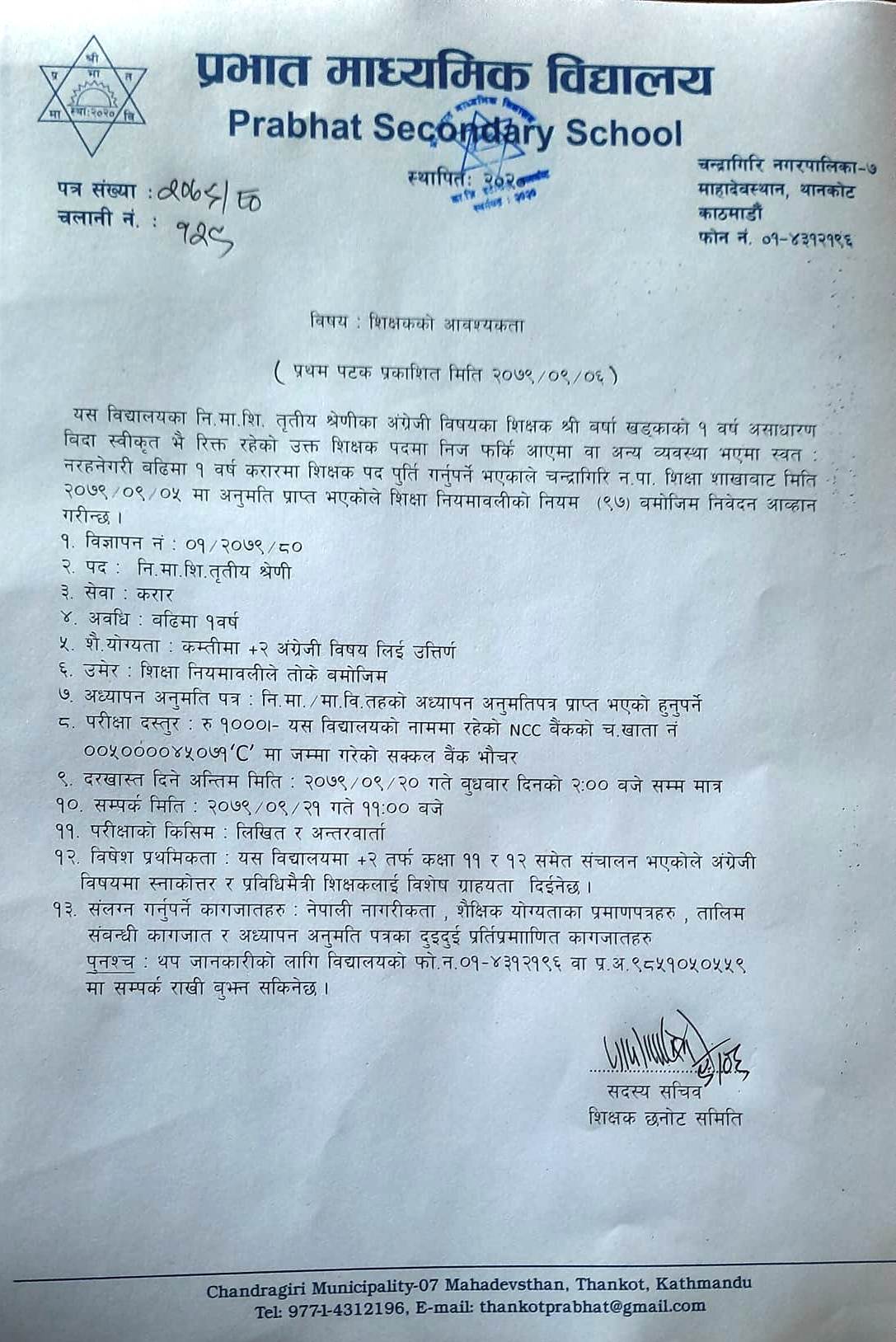 चन्द्रागिरि नगरपालिका-०७ थानकोट चेकपोष्टस्थित प्रभात माध्यमिक विद्यालयले निमावि तहमा अंग्रेजी शिक्षक पदपूर्तिका लागि सूचना जारी गरेको छ ।