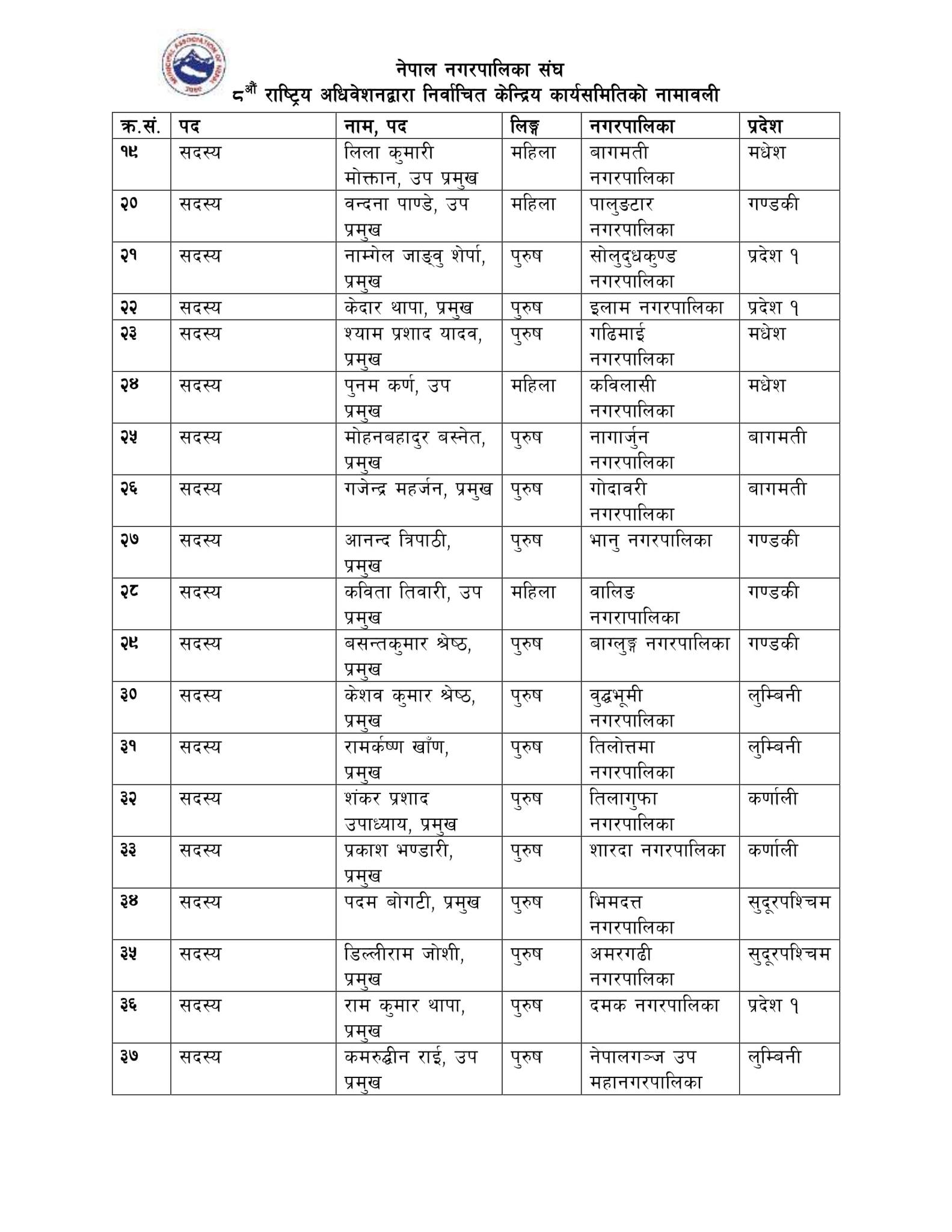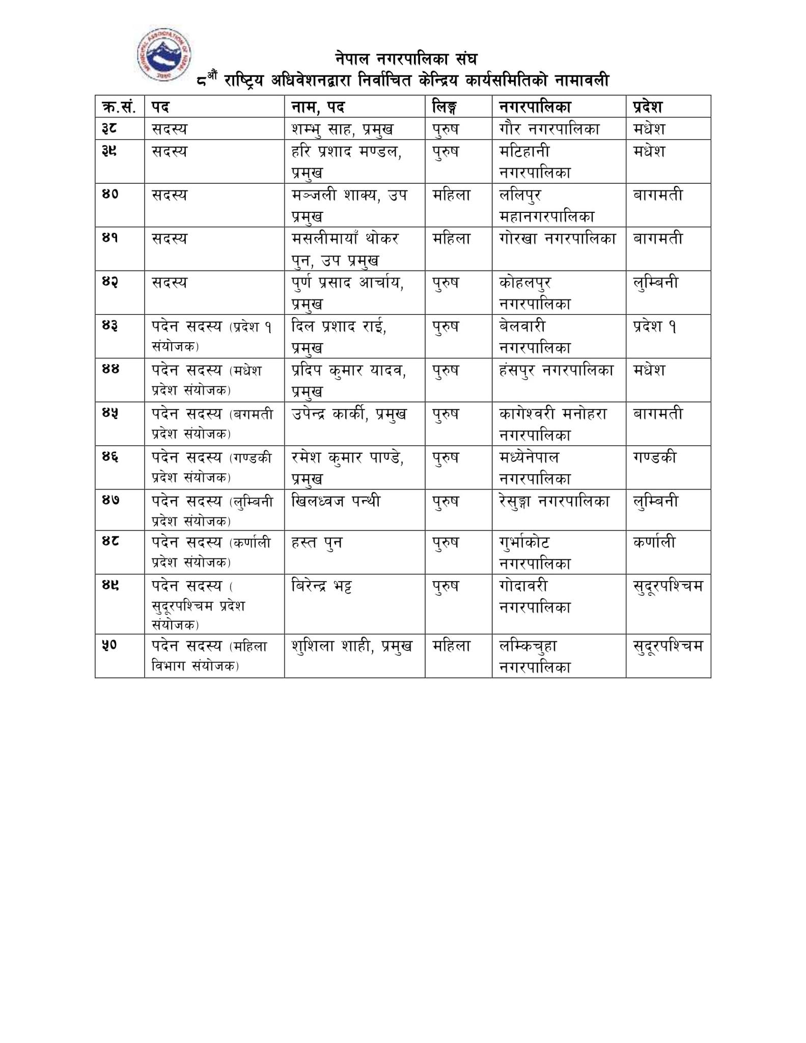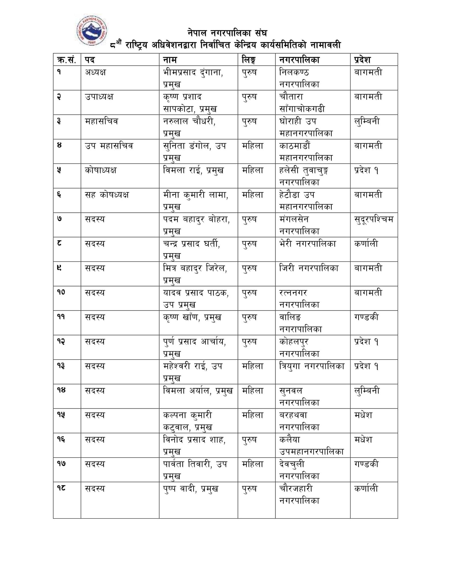 उपाध्यक्षमा सिन्धुपाल्चोकको चौतारा साँगाचोकगढीका मेयर कृष्णप्रसाद सापकोटा, महासचिवमा दाङको घोराही उपमहानगरपालिकाका मेयर नरूलाल चौधरी चयन भएका हुन्।