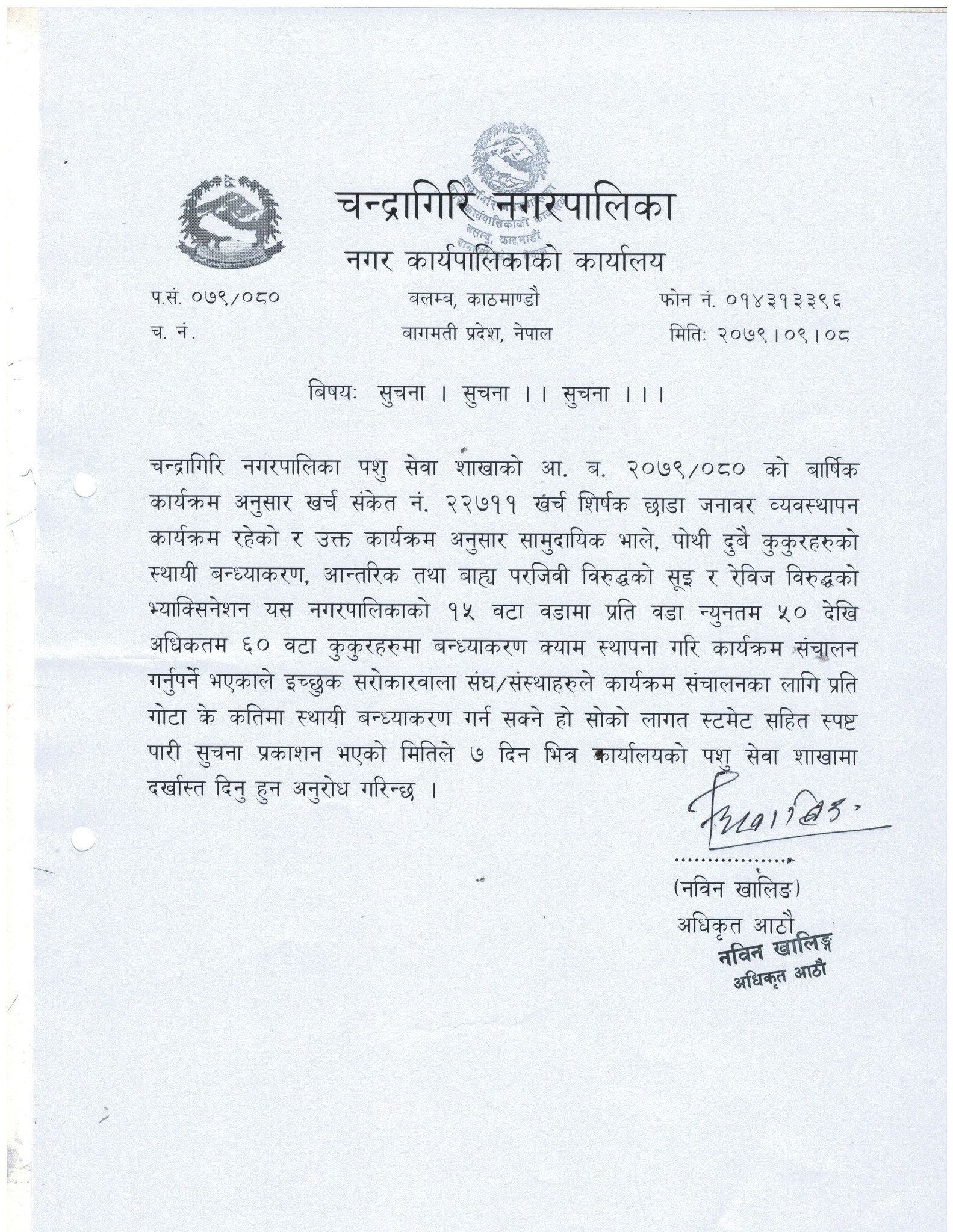 नगरले शुक्रबार एक सूचना जारी गर्दै नगर क्षेत्रका सबै वडाहरूमा छाडा कुकुरहरूमा बन्ध्याकरण गर्नका लागि इच्छुक सरोकारवाला संघ संस्थाहरूहरूसँग प्रस्ताव आह्वान गरेको हो ।