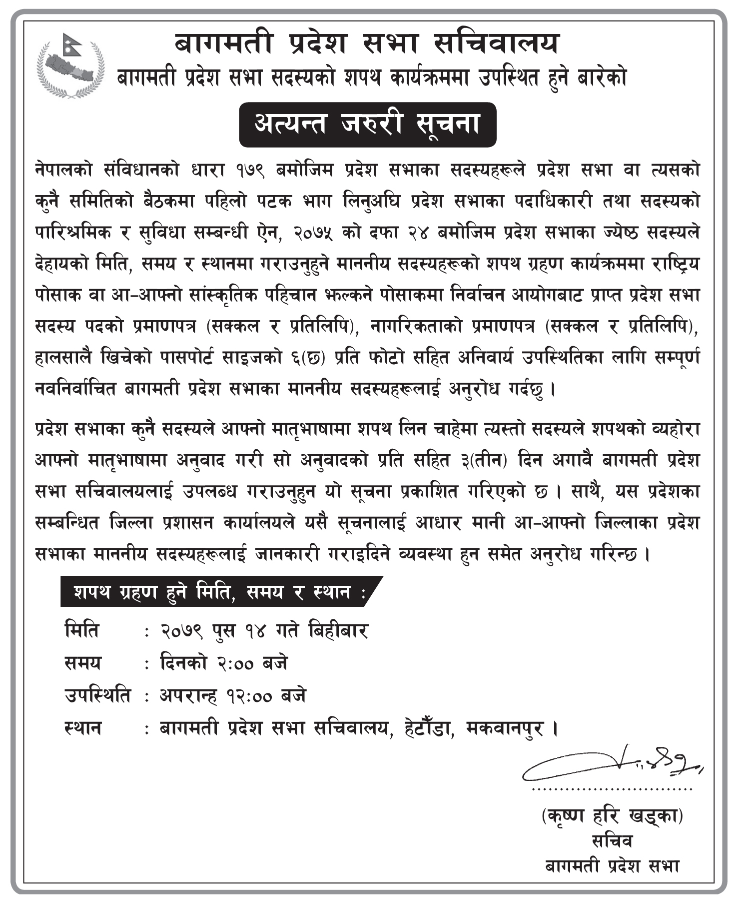 प्रदेश सभाका कुनै सदस्यले आफ्नो मातृभाषामा शपथ लिन चाहेमा त्यस्तो सदस्यले शपथको व्यहोरा आफ्नो मातृभाषामा अनुवाद गरी सो अनुवादको प्रति सहित ३ (तीन) दिन अगावै बागमती प्रदेश सभा सचिवालयलाई उपलब्ध गराउनुहुन पनि सूचनामा उल्लेख छ ।