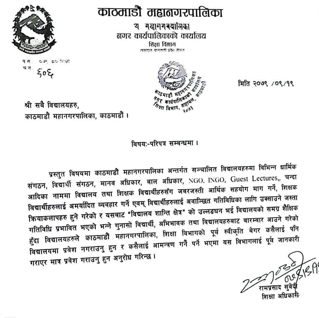 काठमाडौं महानगरपालिकाको शिक्षा विभागले पूर्व स्वीकृति बेगर कसैलाई विद्यालयमा प्रवेश नगराउन विद्यालयहरुलाई परिपत्र गरेको छ ।