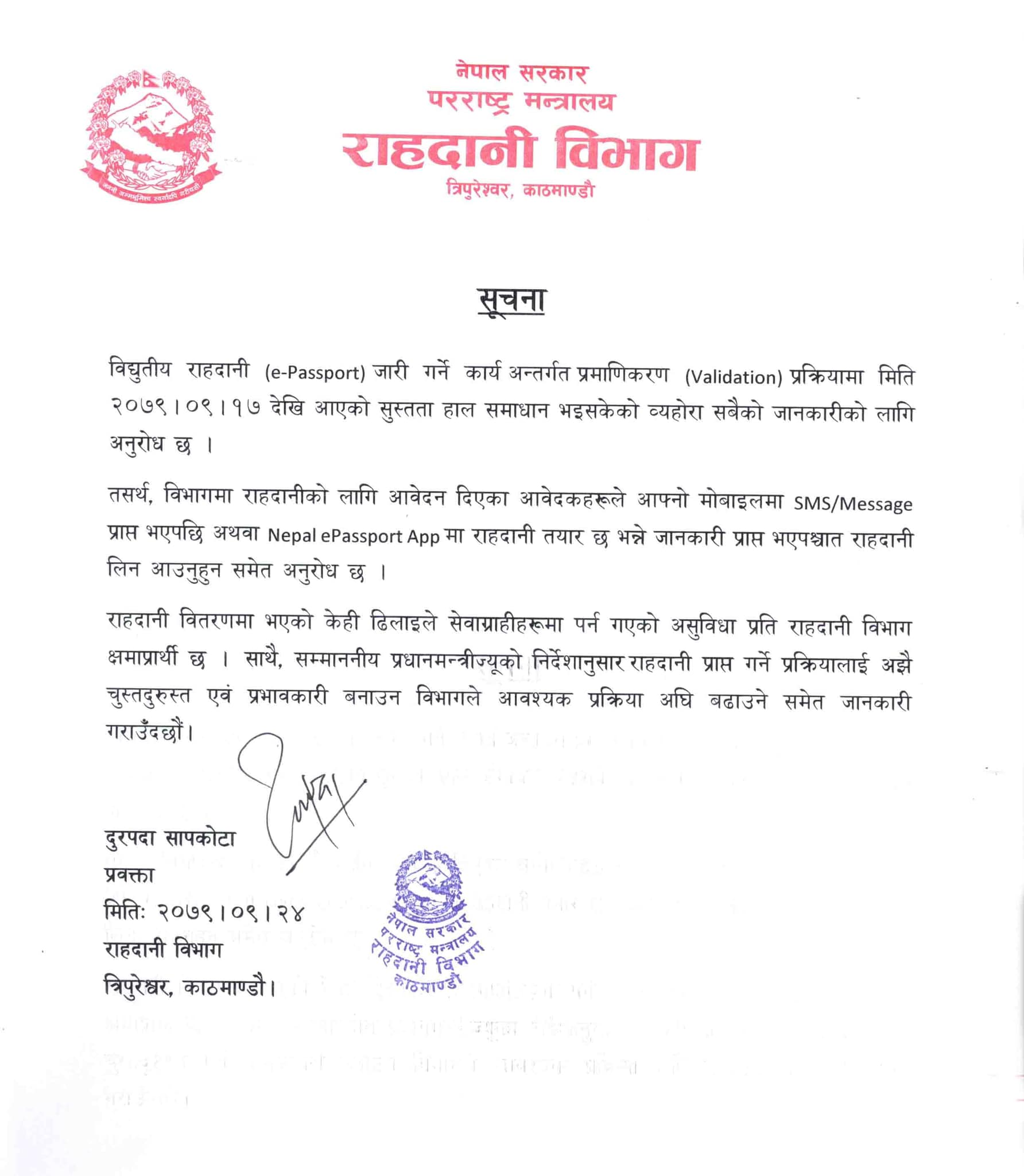 विद्युतीय राहदानी जारी गर्ने कार्य अन्तर्गत प्रमाणिकरण प्रक्रियामा देखिएको प्राविधिक समस्या हल भएको छ ।