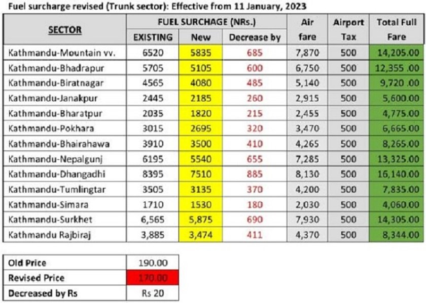 यससँगै, यसअघि प्रतिलिटर १९० रुपैयाँ रहेको हवाई इन्धनको मूल्य १७० रुपैयाँ कायम भएको छ । हवाई इन्धनको मूल्य घटेसँगै नियमित र चार्टडतर्फको हवाई मूल्य घटेको संघले जनाएको छ । यसमध्ये काठमाडौँ–धनगढीको मूल्य सबैभन्दा धेरै घटेको छ । संघका अनुसार काठमाडौँ-धनगढीको हवाई भाडा ८८५ रुपैयाँले घटेको छ ।
