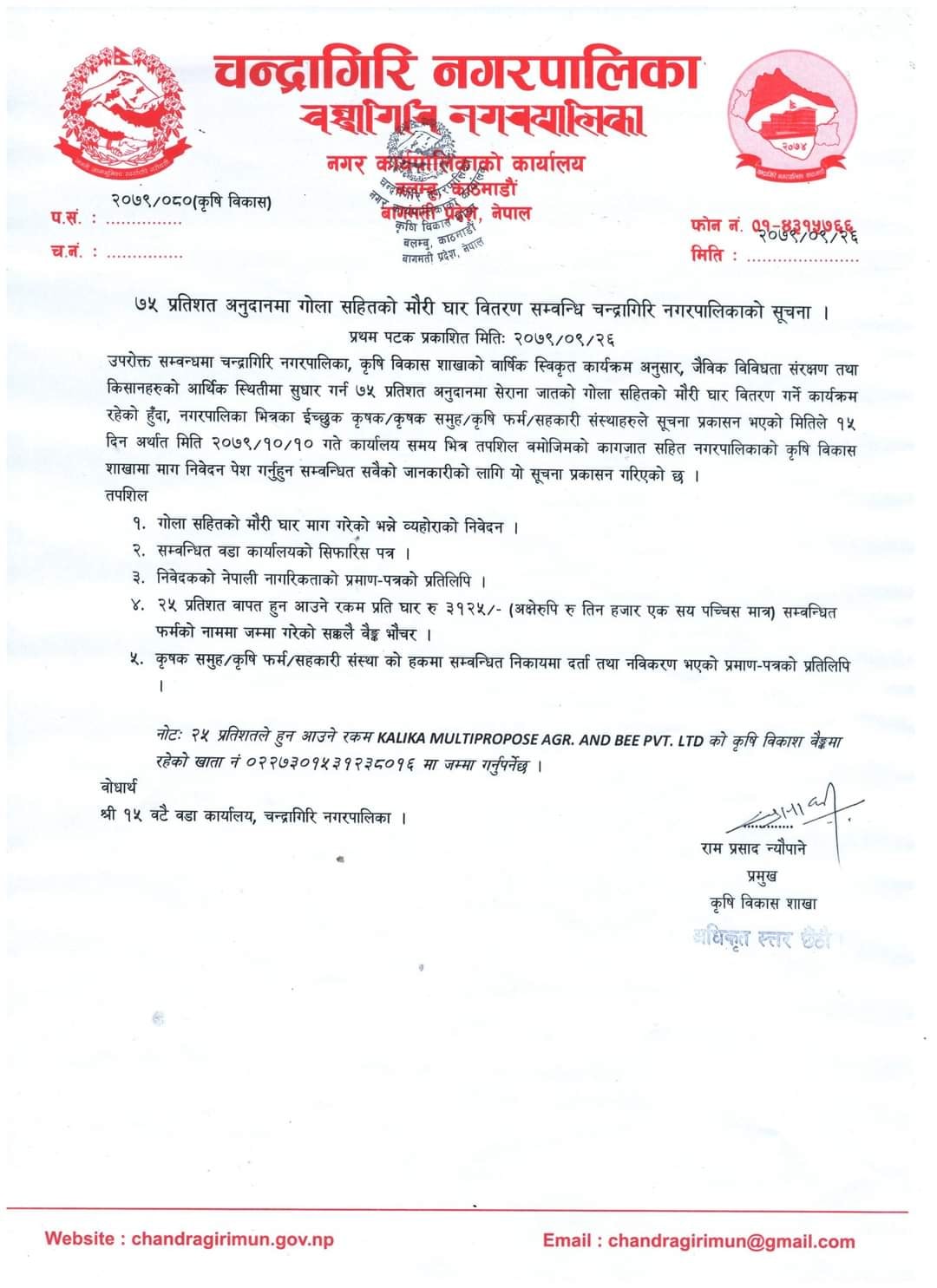 नगरपालिकाले ७५ प्रतिशत अनुदानमा गोलासहितको मौरी घार वितरणका लागि माैरी घार वितरण गर्न लागेको हो ।