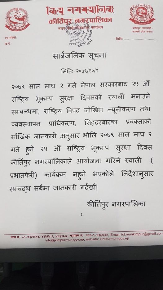 नगरपालिकाले आइतबार एक सूचना जारी गर्दै राष्ट्रिय विपद जोखिम न्यूनीकरण तथा व्यवस्थापन प्राधिकरणको जानकारी अनुसार भोलि माघ २ गतेका लागि २५ औं राष्ट्रिय भूकम्प दिवसका अवसरमा र्याली आयोजनाको तयारी गरिएको थियो ।