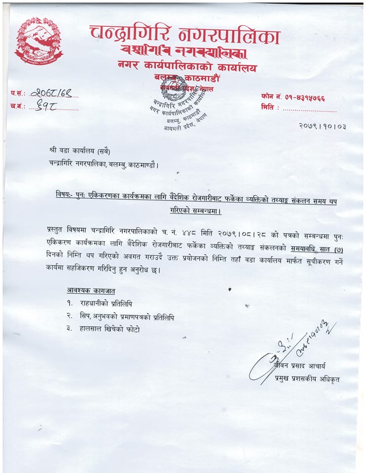 चन्द्रागिरि नगरपालिकाले वैदेशिक रोजागरीबाट फर्किएका आफ्ना नगरबासीहरूको विवरण संकलनको अवधि थप गरेको जनाएको छ ।