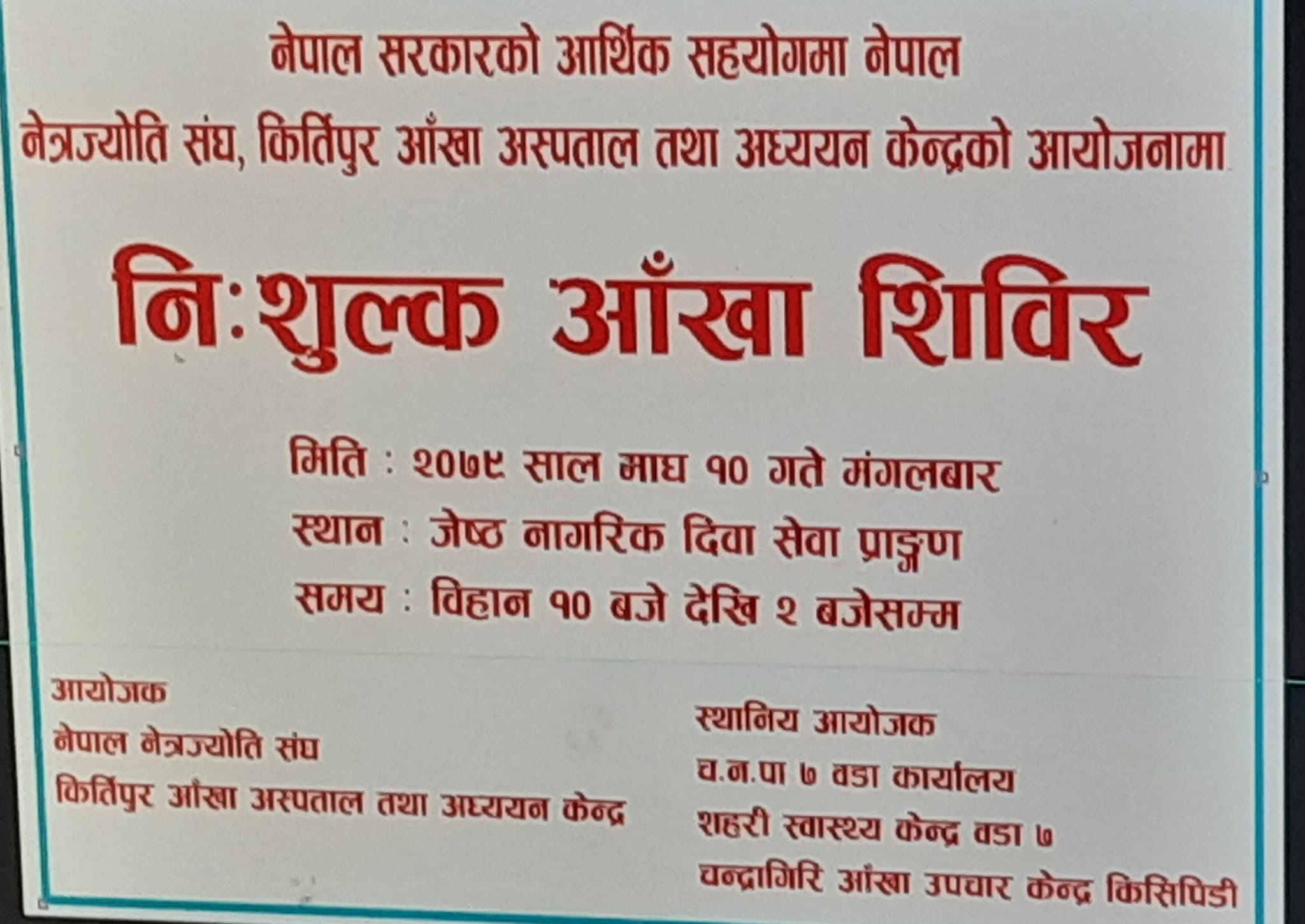 माघ १० गते मंगलबार चन्द्रागिरि नगरपालिका वडा नं. ७ को कार्यालय तथा नेपाल नेत्रज्योति संघ कीर्तिपुर आँखा अस्पताला तथा अध्ययन केन्द्रको संयुक्त आयोजनामा सो शिविर स्थानीय ज्येष्ठ नागरिक भवन दिवा सेवा केन्द्रमा सञ्चालन हुने वडाध्यक्ष शम्भुकुमार केसीले जानकारी दिनुभयो ।