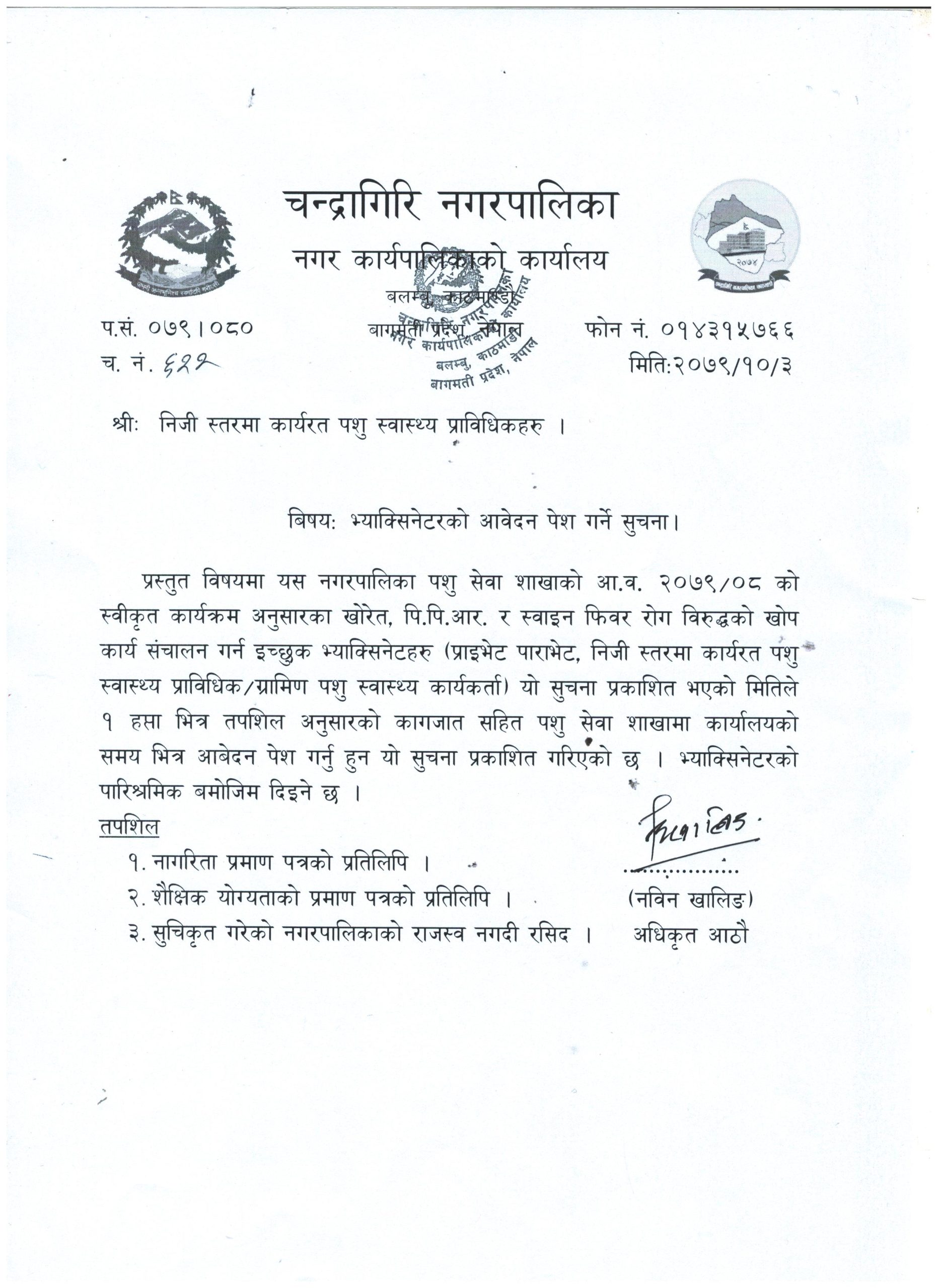 चन्द्रागिरि नगरपालिकाले नगर क्षेत्रमा सञ्चालन हुने पशु खोप कार्य सञ्चालनका लागि पशु स्वास्थ्य प्राविधिक भ्याक्सिनेटरका आवेदन माग गरेको छ ।