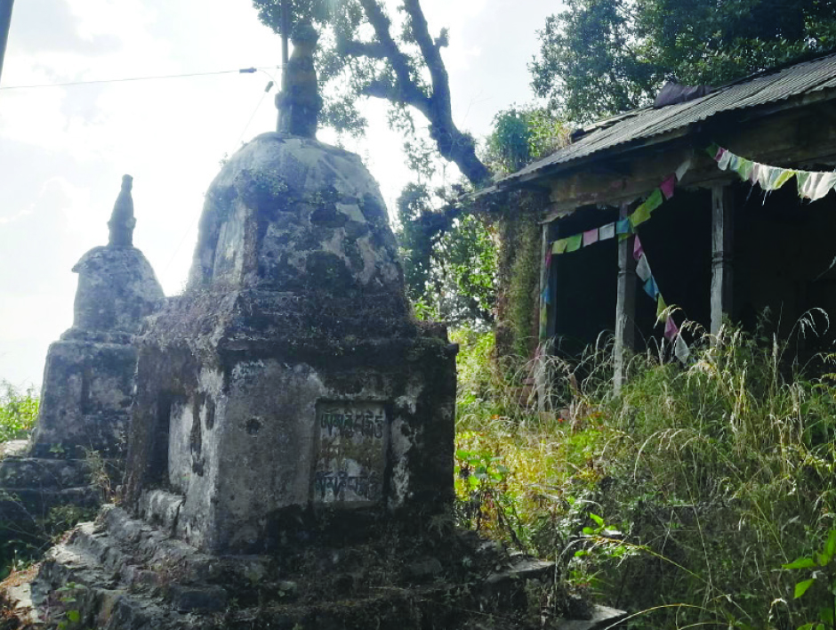 भञ्ज्याङबाट पहिले सोझै चित्लाङ झर्ने बाटो थियो, अहिले पश्चिमतिर जाने अर्कोे पनि बाटो बनिसकेको छ। पहाडको टुप्पोमा बनाइएको गणेशमान भवनसम्म पुग्ने बाटो पछ्याउँदै पूर्वतिर लाग्यौं। आँखाले स्तूप वा स्तूपका भग्नावशेष खोज्दै गर्दा झाडीभित्र इँटाको गारो र छेवैमा पुरानो, मक्किइसकेको लुङ्दर देखियो। झाडीभित्र मुश्किलले पसेर हेर्दा दुई स्तूप र पाटी देखिए। कुनै समय यात्रुलाई सुस्ताउन वा उस्तै परे बास बस्न बनाइएको पाटी अहिले झाडीभित्र छोपिनुका साथै जीर्ण भएर भत्किने अवस्थामा छ। पाटी अगाडि ढुङ्गा र माटोले बनाइएका दुई स्तूप छन्। थुम्कोमा थोरै मात्र भूस्खलन भयो भने स्तूप खस्ने जोखिम छ।