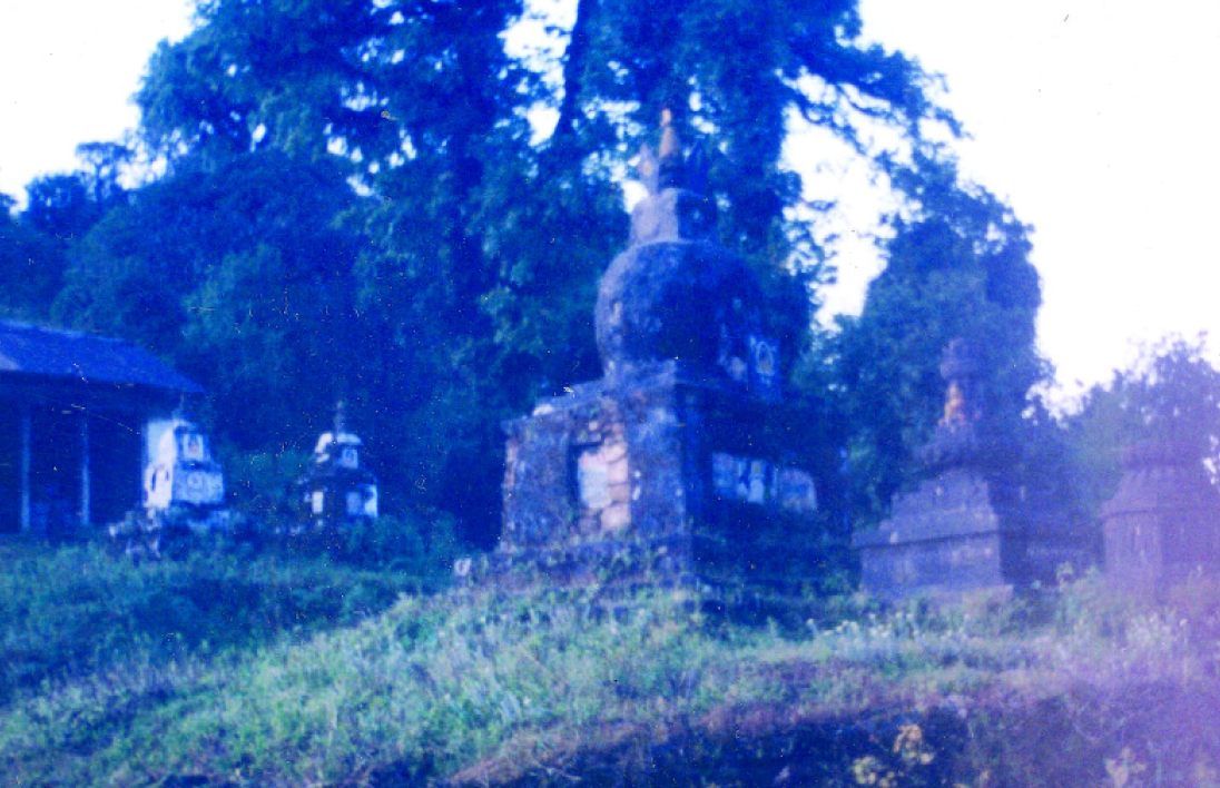 अब २०५५ सालमा खिचिएको तस्वीरमा देखिएको, यो थुम्कोभन्दा अगाडिको सानो थुम्कोमा रहेको ढुङ्गा र माटोले निर्मित अलि ठूलो र त्यसको छेउमै ढुङ्गाको सानो स्तूप र धर्मधातु खोज्नु थियो। बाटो चौडा पार्न दायाँ-बायाँको थुम्को ताछिएकाले स्तूप रहेको स्थान अनुमान गर्नै कठिन थियो।