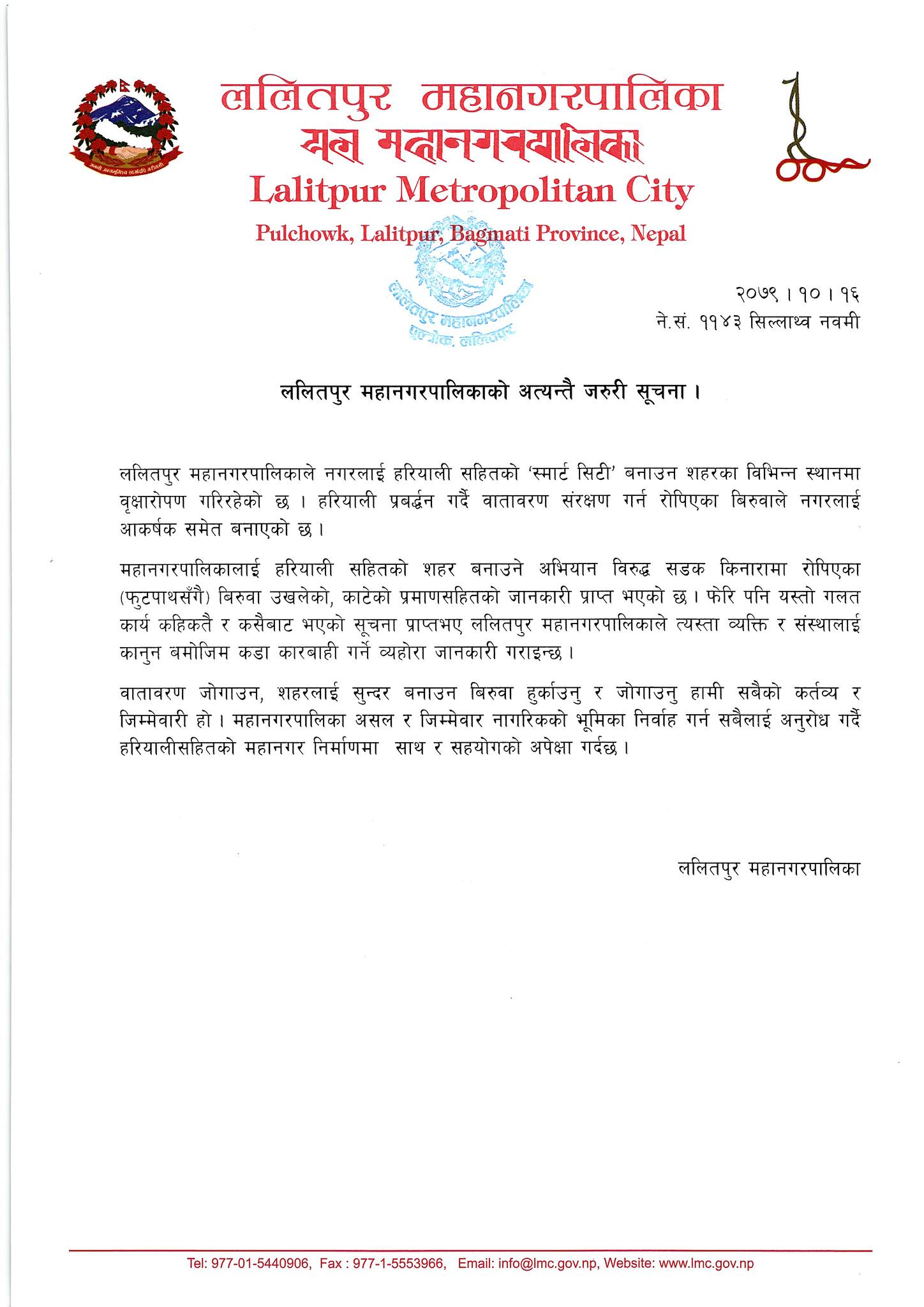ललितपुर महानगरपालिकाले सडक किनारामा रोपिएका बिरुवालाई नष्ट गर्नेलाई कारबाही हुने बताएको छ । शहरलाई हरियाली बनाउने अभियानविरुद्ध बिरुवा फालिएको प्रमाण प्राप्त भएको महानगरले जनाएको छ ।