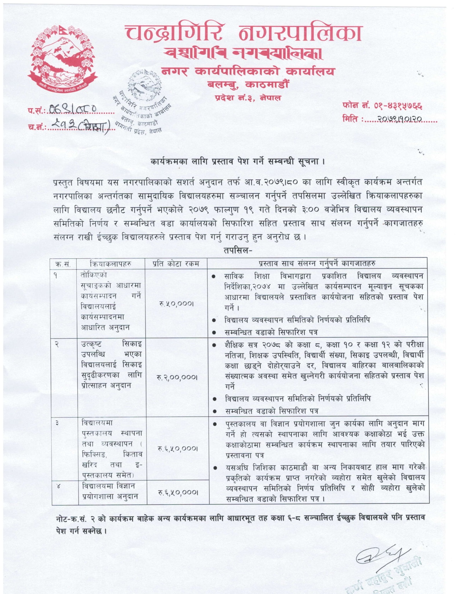 चन्द्रागिरि नगरपालिकाले नगरक्षेत्रभित्र सञ्चालनमा रहेका सामुदायिक विद्यालयहरूको शैक्षिक गुणस्तर सुदृढीकरणका लागि प्रस्ताव आह्वान गरेको छ ।