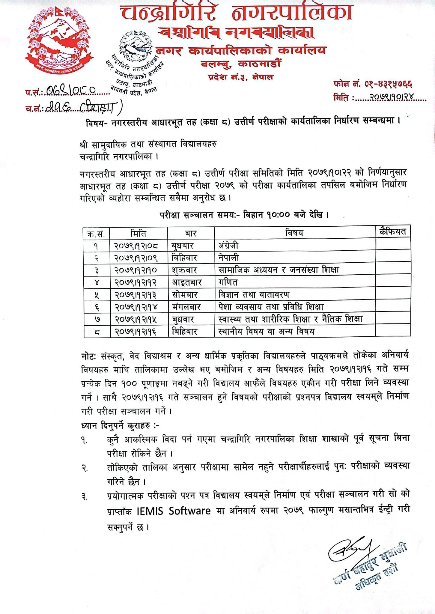चन्द्रागिरि नगरपालिकामा नगरस्तरीय आधारभूत तह (कक्षा ८) उत्तीर्ण परीक्षाको तालिका सार्वजनिक भएको छ । नगरस्तरीय आधारभूत तह उत्तीर्ण परीक्षा समितिको निर्णायानुसार चन्द्रागिरि नगरपालिकामा चैत्र ८ गतेबाट परीक्षा सञ्चालन हुनेछ ।