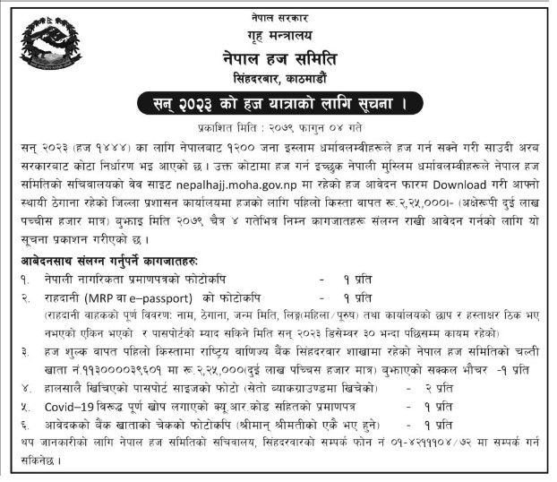 हज यात्राका लागि पहिलो किस्तावापतको दुई लाख २५ हजार रुपैयाँ आफ्नो जिल्ला प्रशासन कार्यालयमा बुझाएर निवेदन दिनुपर्नेछ ।