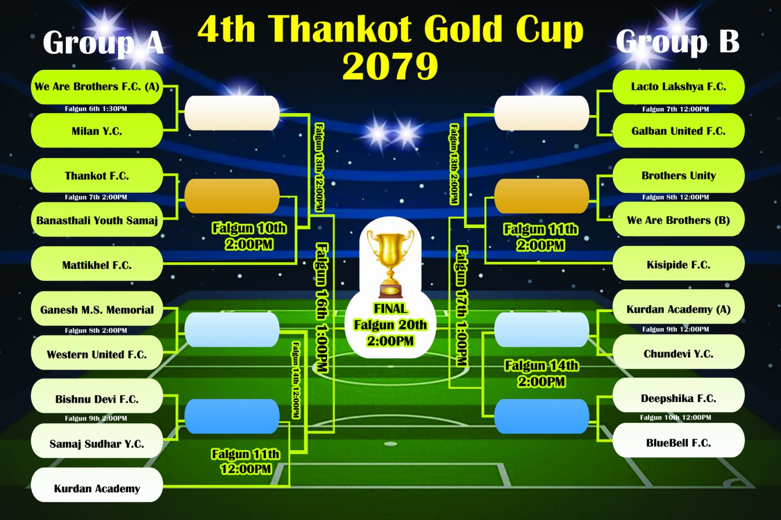 आगामी शनिबारबाट चन्द्रागिरि नगरपालिका-०३ थानकोट पिम्फलीस्थित गलबन फुटबल मैदानमा सुरू हुने चाैथो संस्करणको थानकोट गोल्डकपको उद्घाटन खेलमा साबिक विजेता वी आर ब्रदर्शले मिलन युथ क्लबको सामना गर्ने भएको छ ।