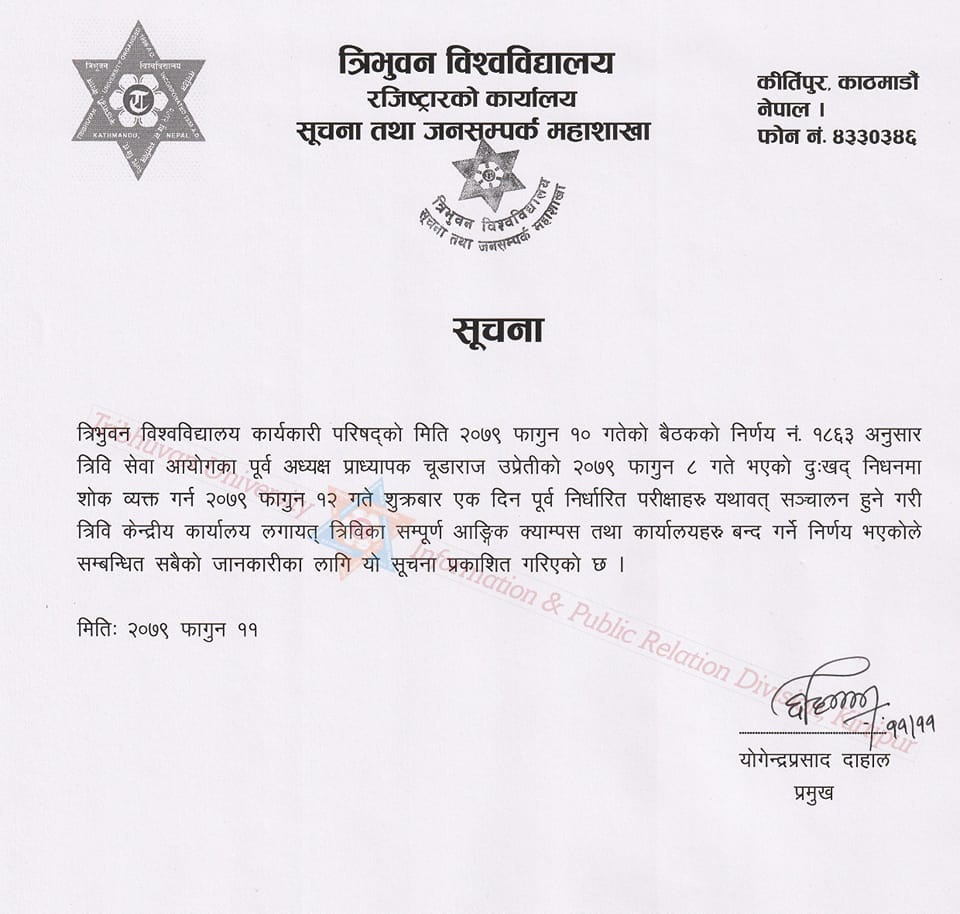 पूर्वनिर्धारित परीक्षाहरू यथावत् सञ्चालन हुने गरी त्रिवि केन्द्रीय कार्यालयलगायत सबै आंगिक क्याम्पस तथा कार्यालयहरूलाई शोक बिदा दिने निर्णय भएको रजिष्ट्रार कार्यालय सूचना तथा जनसम्पर्क महाशाखा प्रमुख योगेन्द्रप्रसाद दाहालले विज्ञप्ति निकालेर जानकारी गराएका छन्।